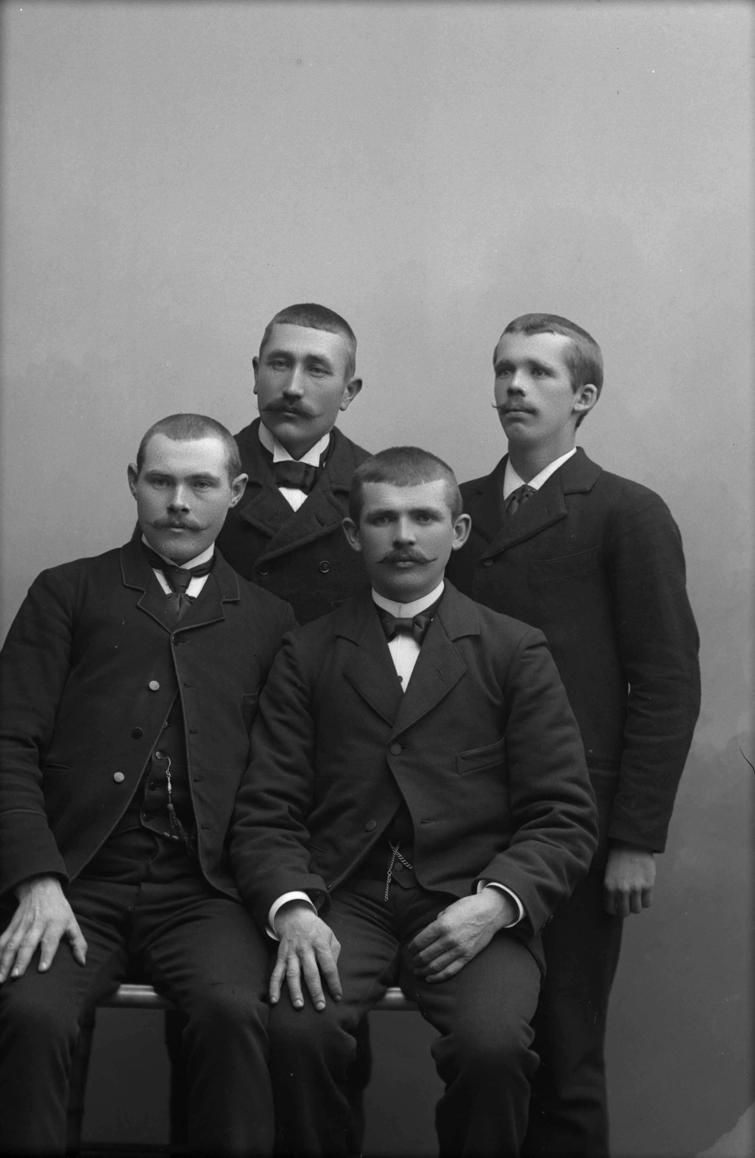 Porträtt i helfigur av Jöns Persson med okänt sällskap, tre andra män, sittande och stående.