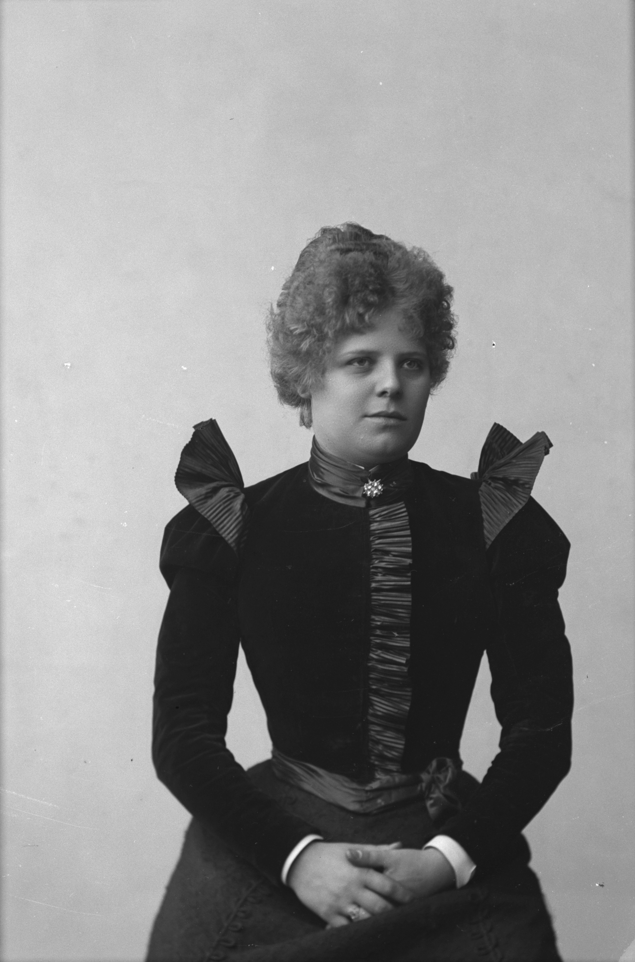 Beskrivning: Porträtt i halvfigur av Hilda Vahlgren.
