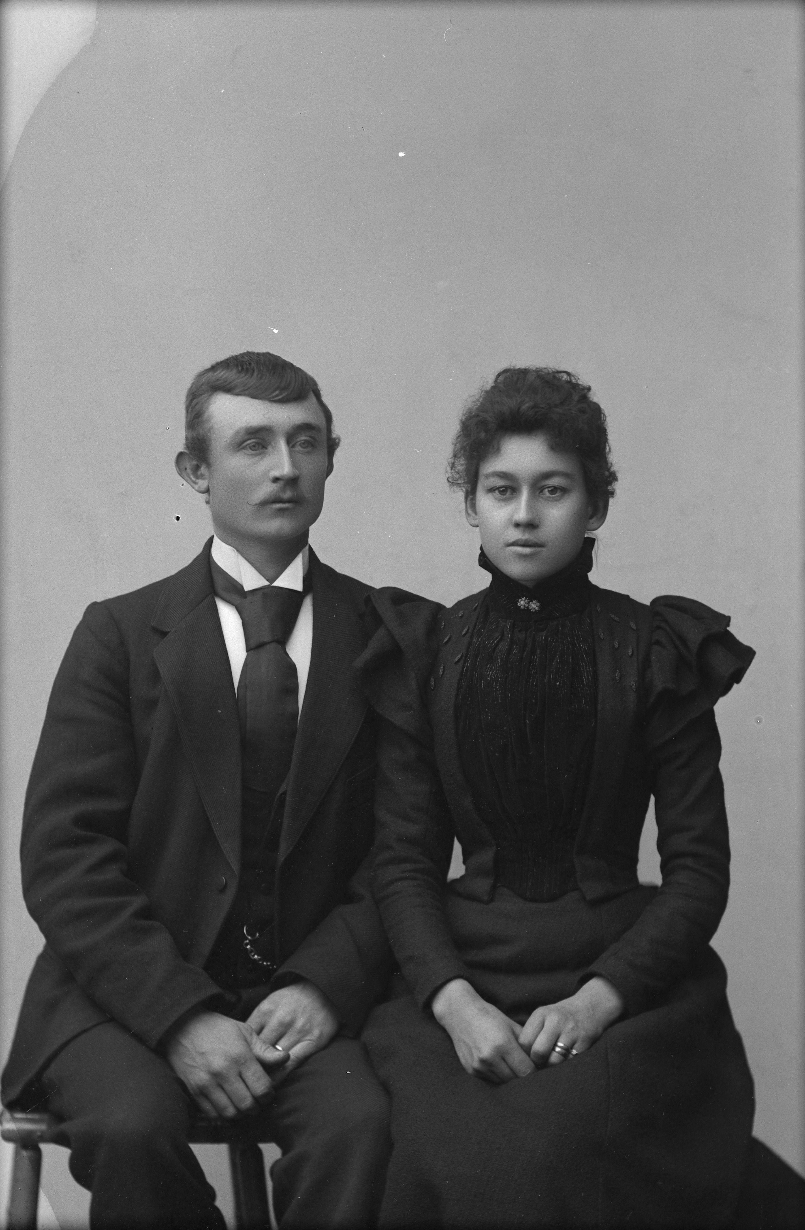 Beskrivning: Porträtt i helfigur av A. Andersson med fru.
