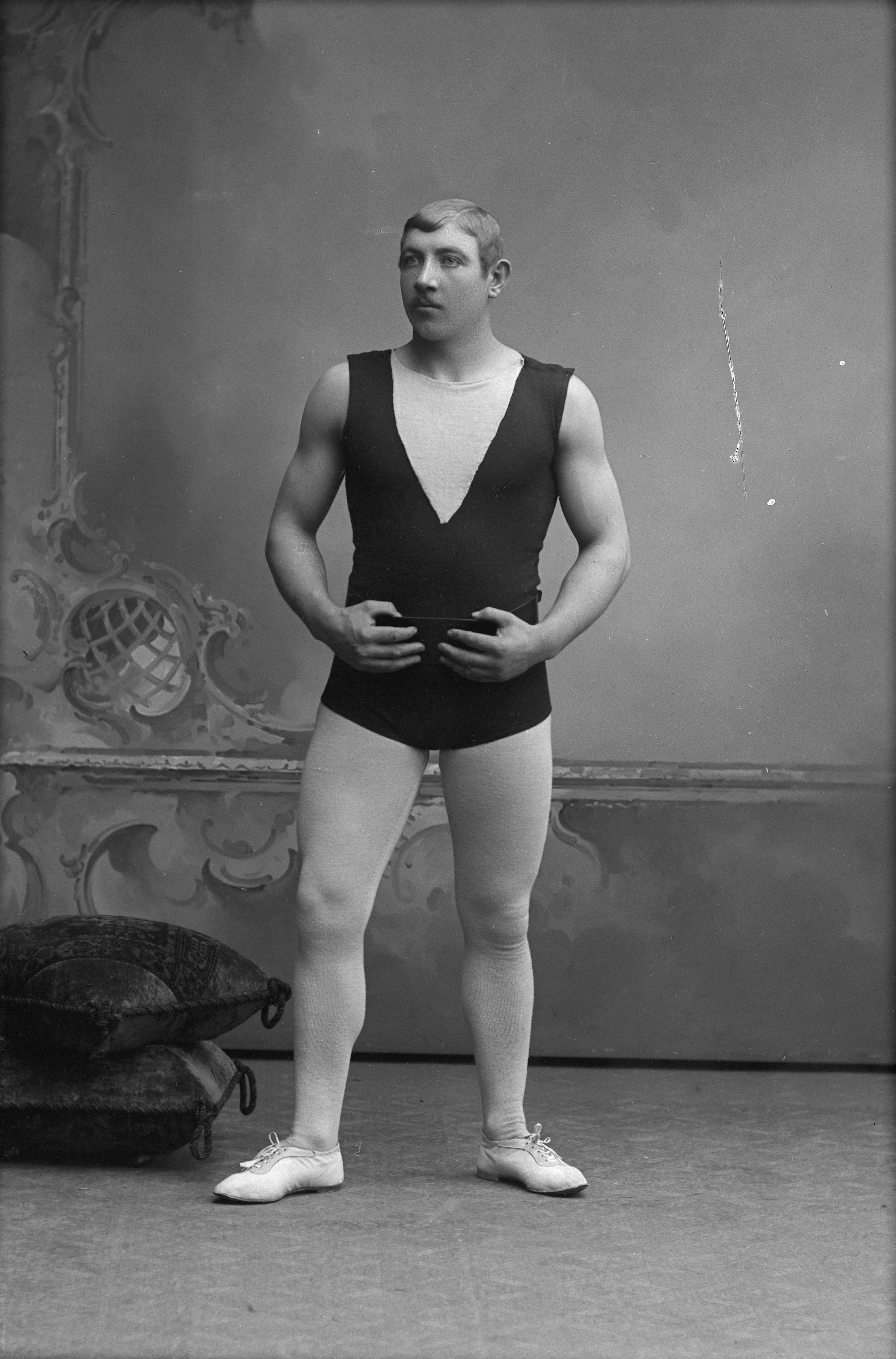 Porträtt i helfigur av A. Persson, iklädd gymnastikdräkt.