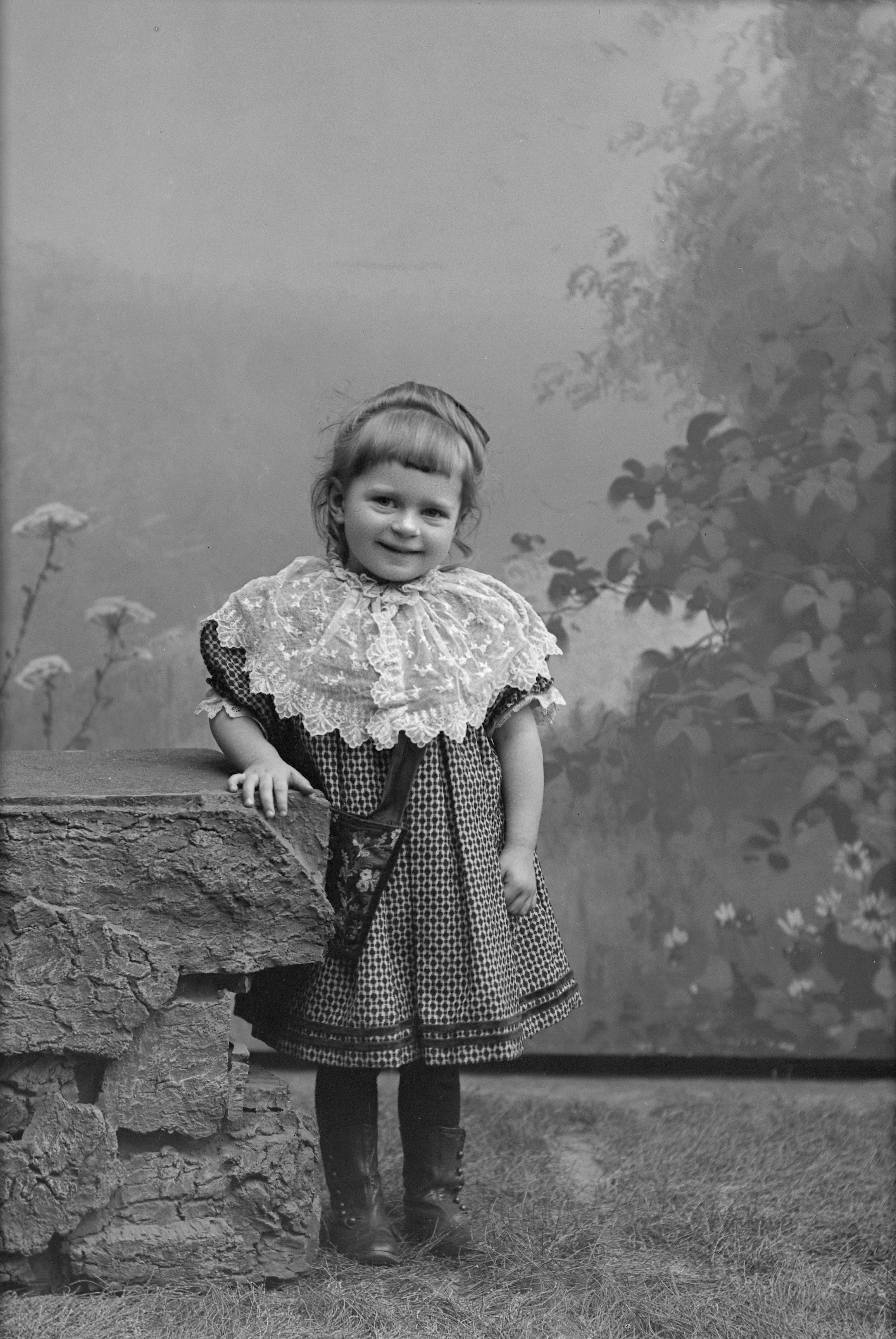 Porträtt i helfigur av Lundbergs dotter, stående vid tegelmur. Fotograferad framför ateljéfond med skogs- och blomstermotiv.