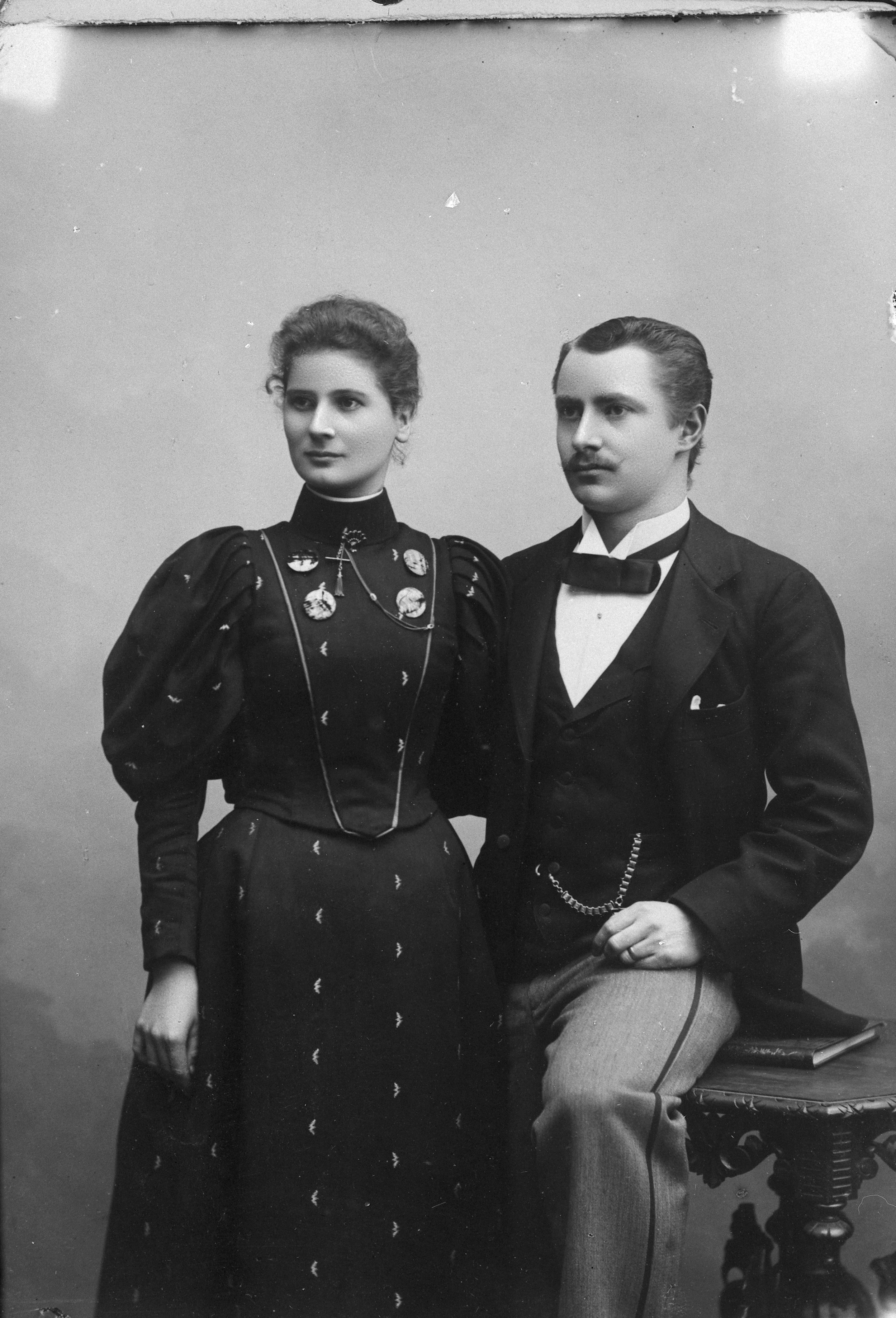 Beskrivning: Porträtt i helfigur av herr Sjöberg med fru. Han sittande på bord.