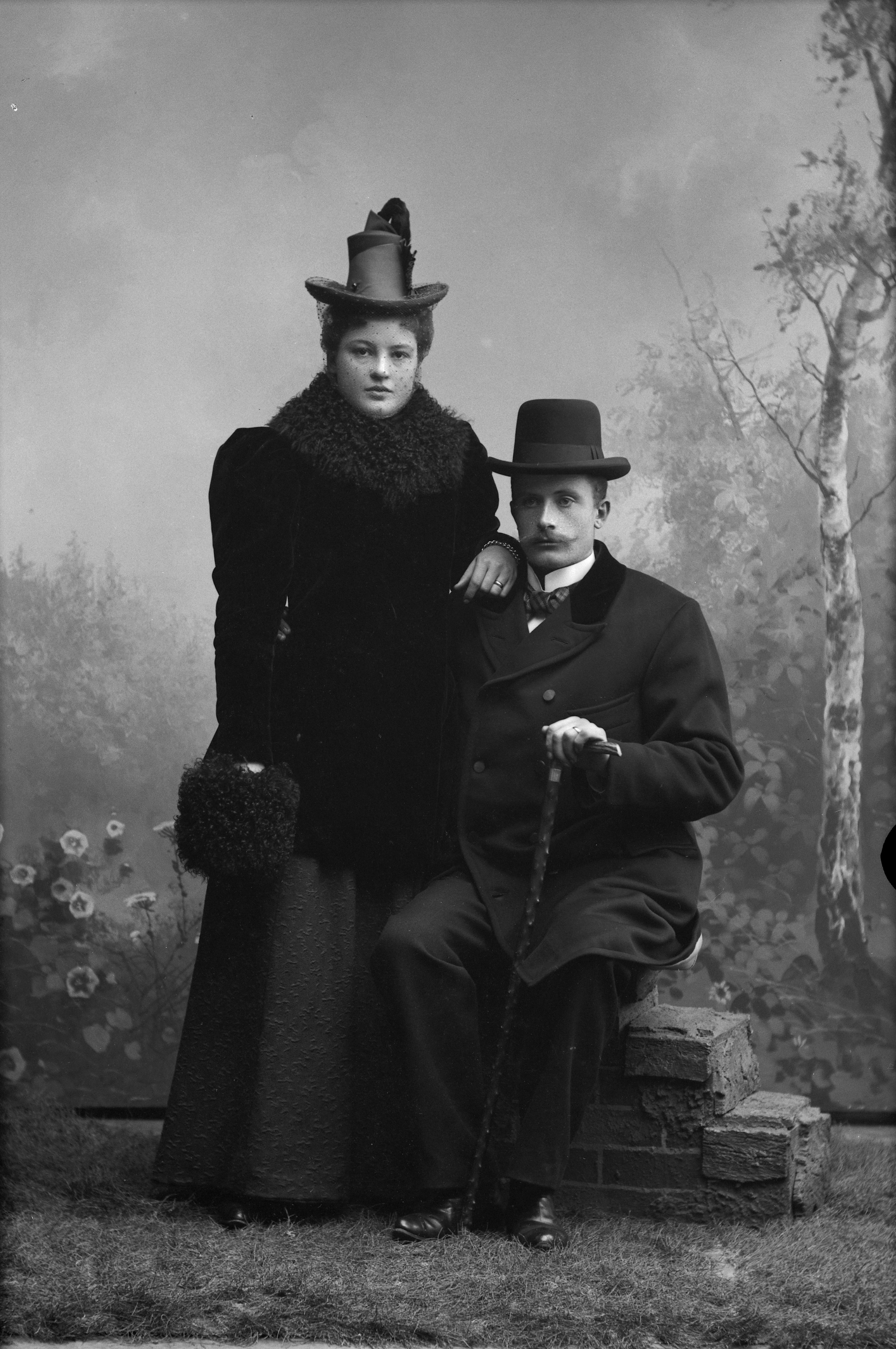Porträtt i helfigur av herr Vall med fru. Mannen sittande på tegelmur, hållande käpp. Båda iklädda hattar, hon i kappa med pälskrage. Fotograferade framför ateljéfond med skogs- och blomstermotiv.