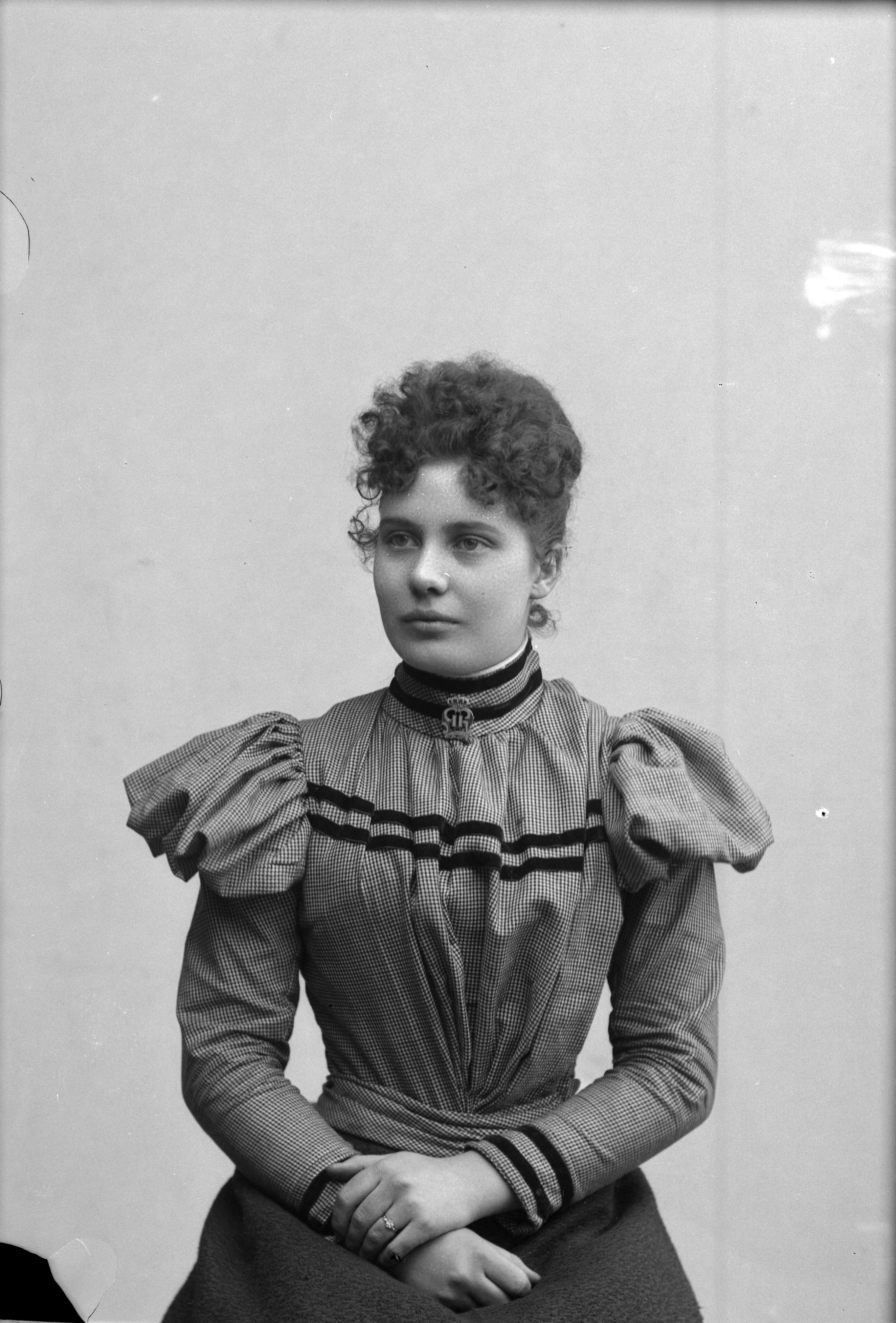 Beskrivning: Porträtt i halvfigur av Elida Åkesson.