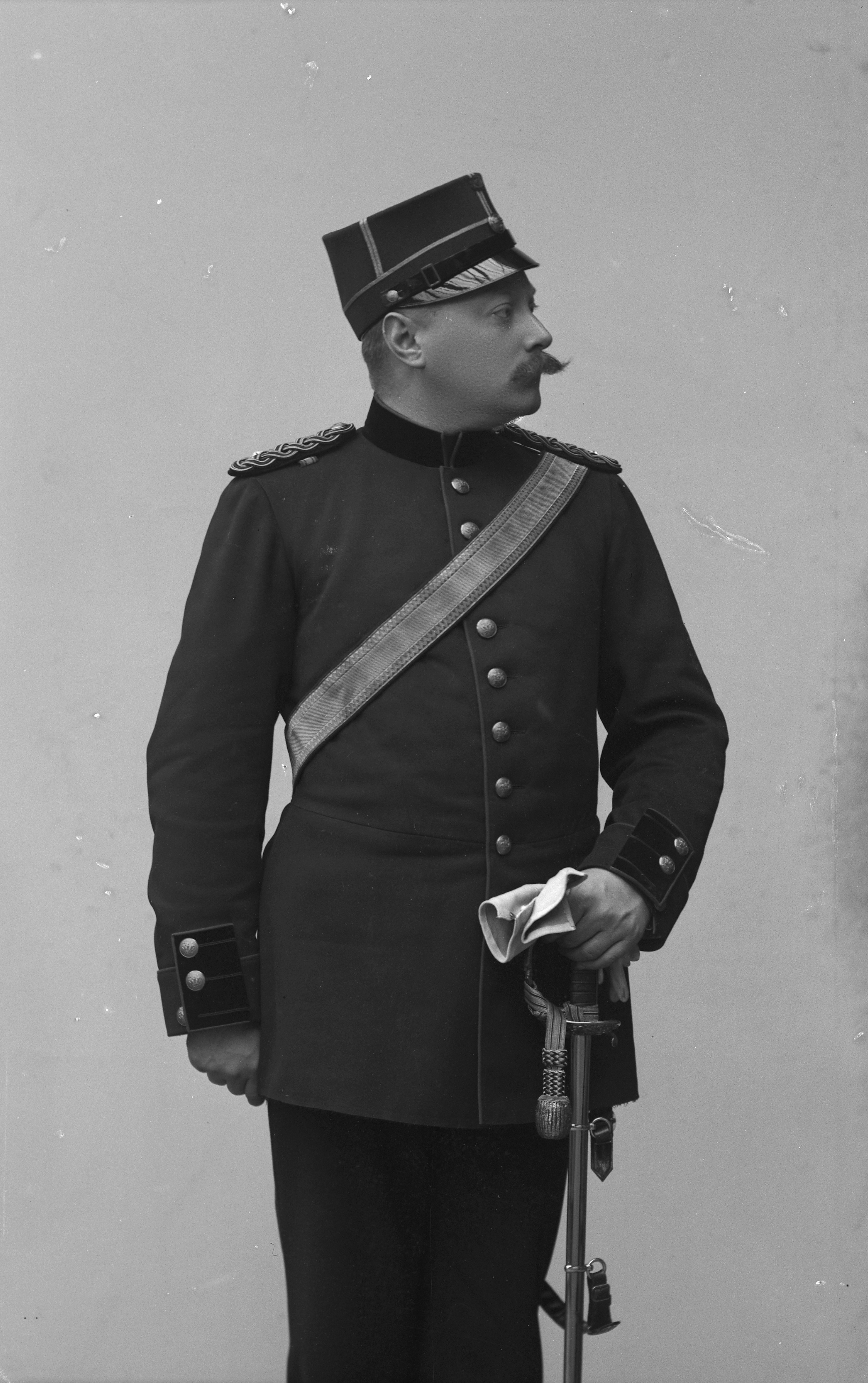 Porträtt i helfigur av militärläkare Almroth, ansikte i profil. iklädd militäruniform och plymförsedd mössa, hållande sabel och handskar.