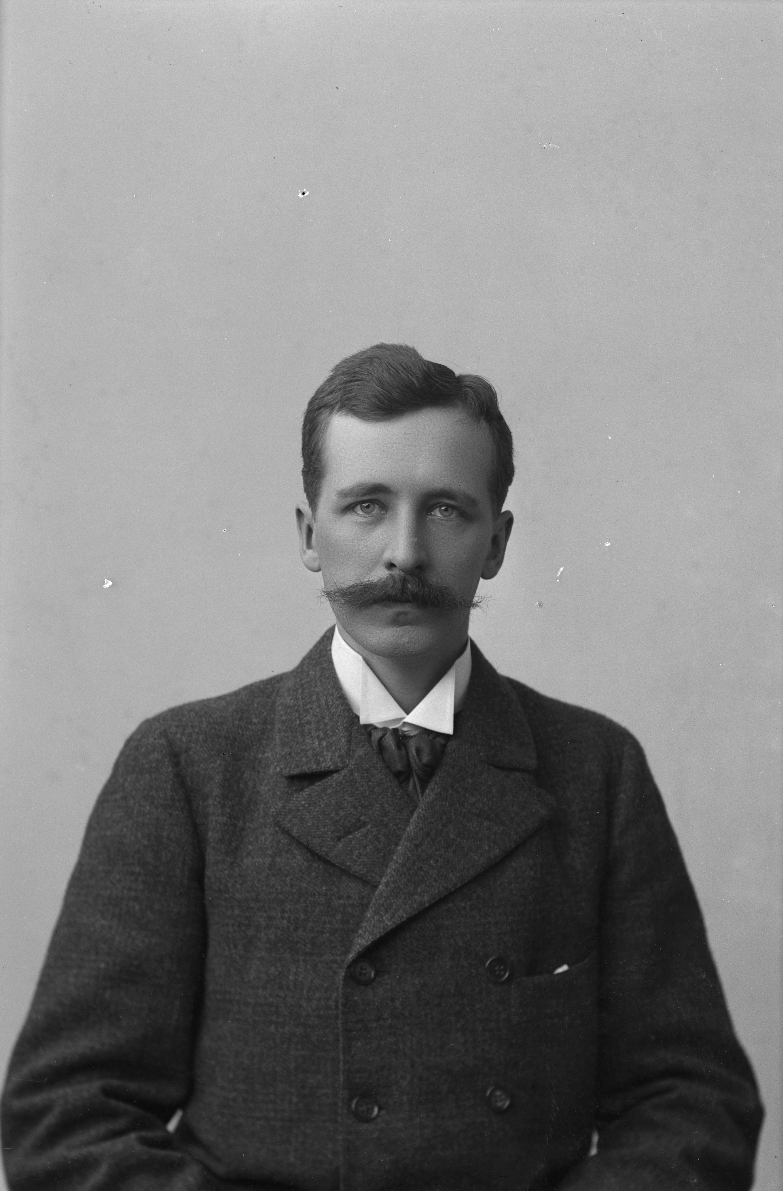 Beskrivning: Porträtt i halvfigur av arkitekt Theodor Wåhlin.