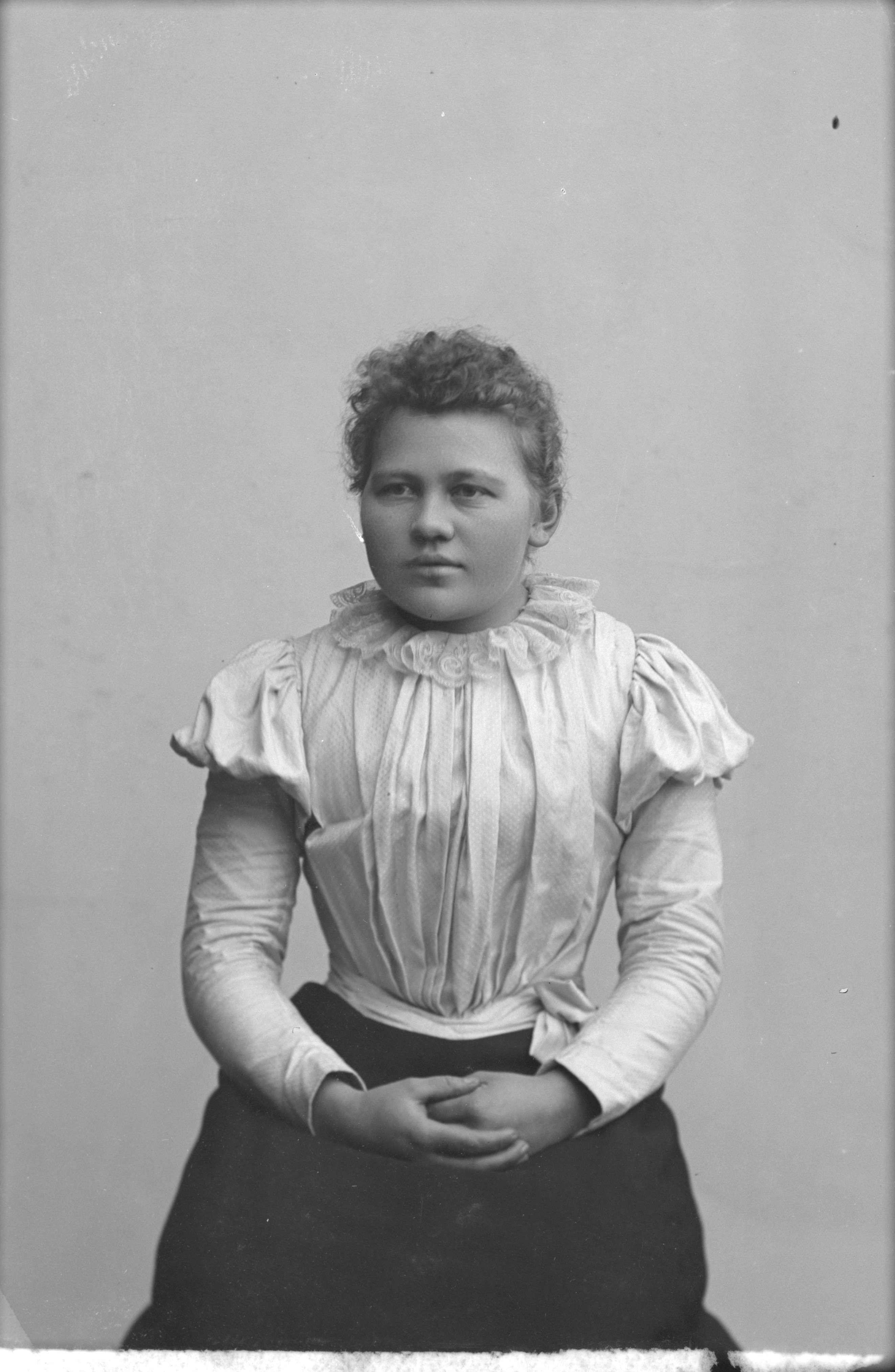 Beskrivning: Porträtt i halvfigur av Elna Johansson i Håslöv.