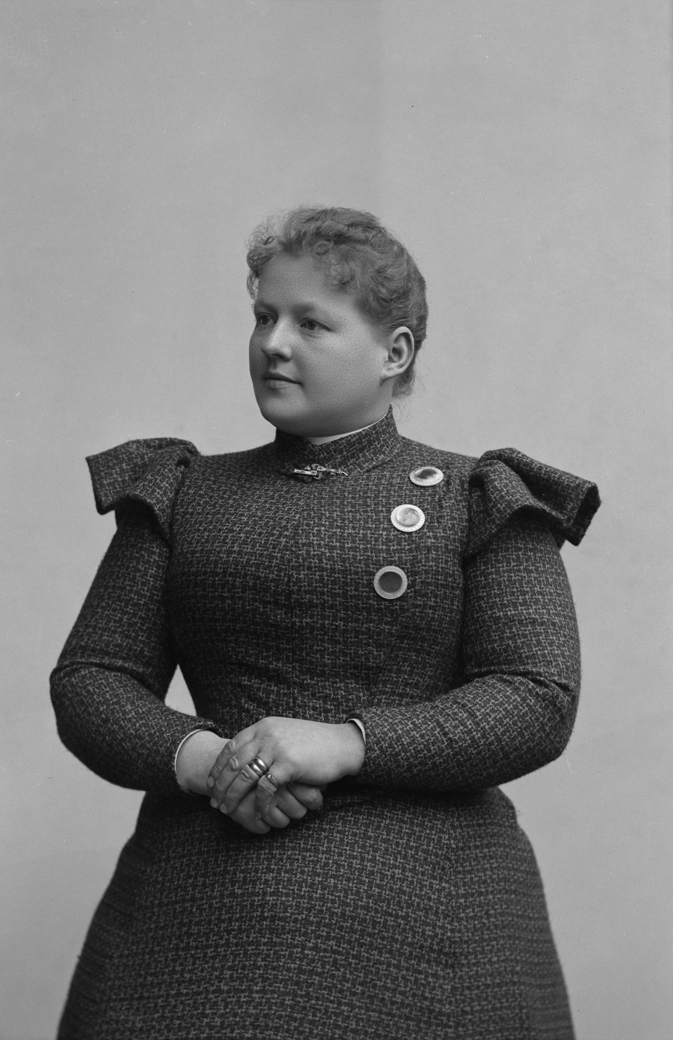 Beskrivning: Porträtt i helfigur av Hans Nielsens fru.