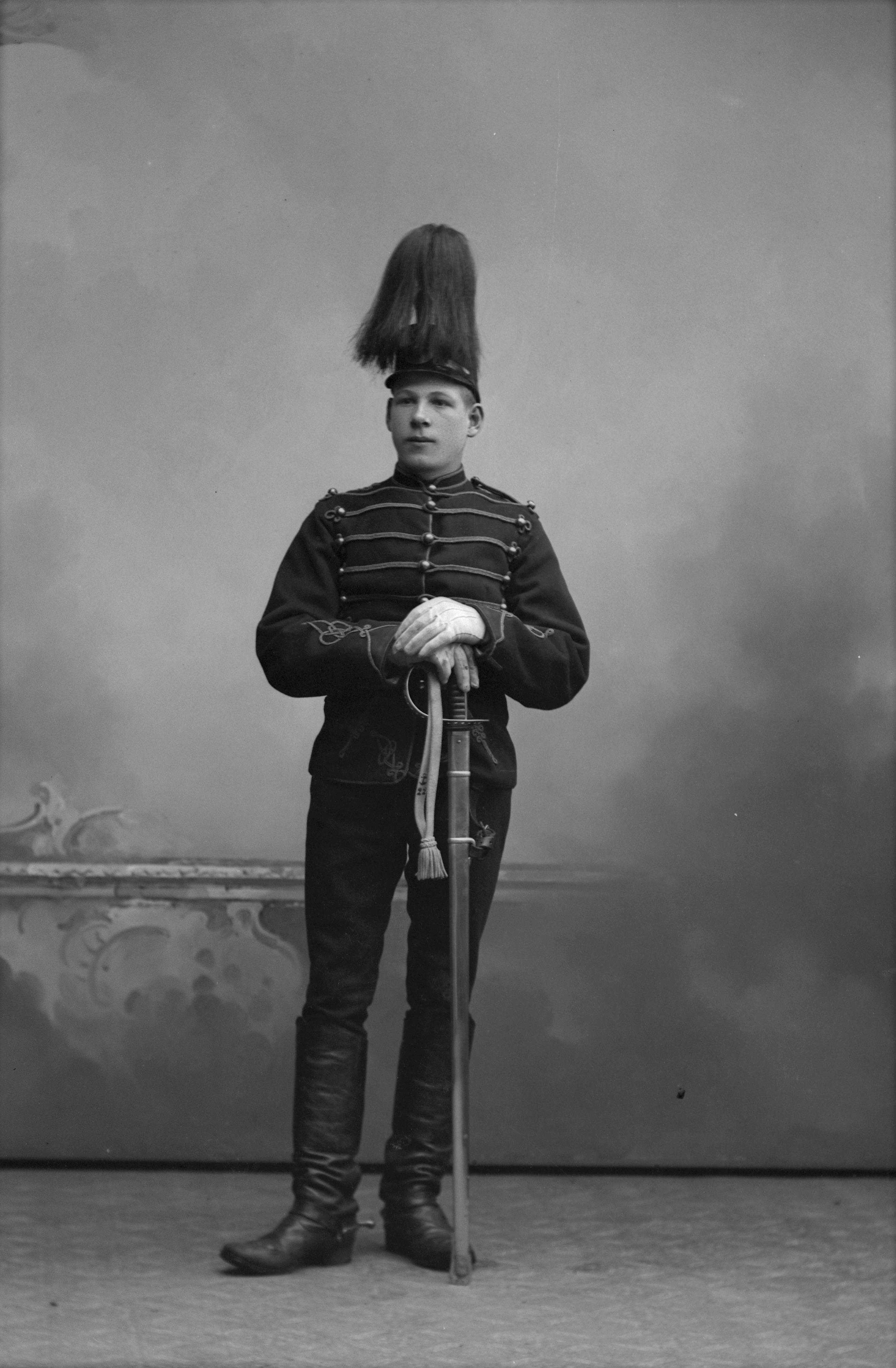 Porträtt i helfigur av husar Lindberg, iklädd militäruniform och plymförsedd hjälm, hållande sabel.