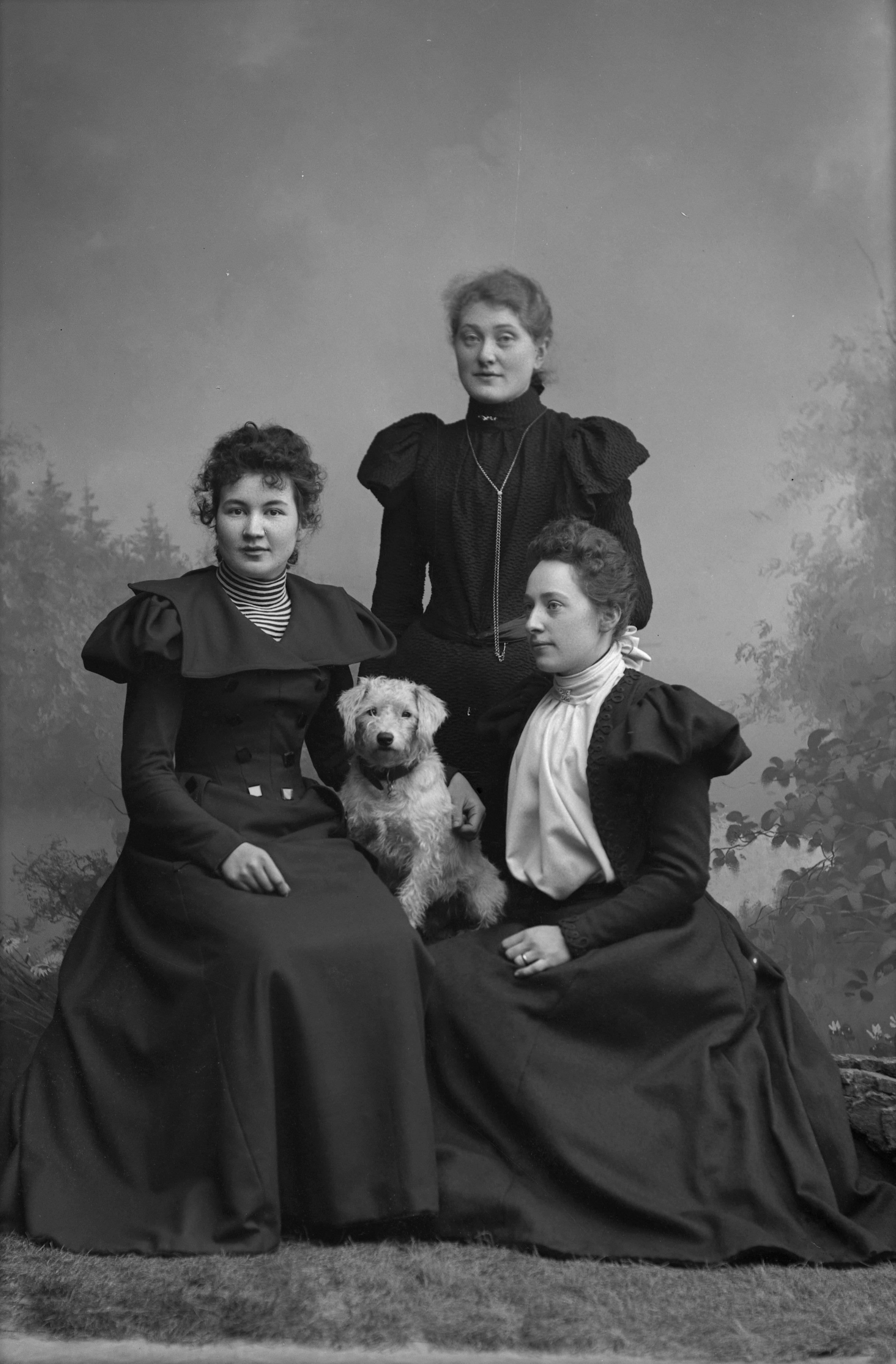 Porträtt i helfigur av fröken Boberg och fröken Richter med okänd kvinna och en hund. Två av kvinnorna sittande. Fotograferade framför ateljéfond med skogsmotiv.