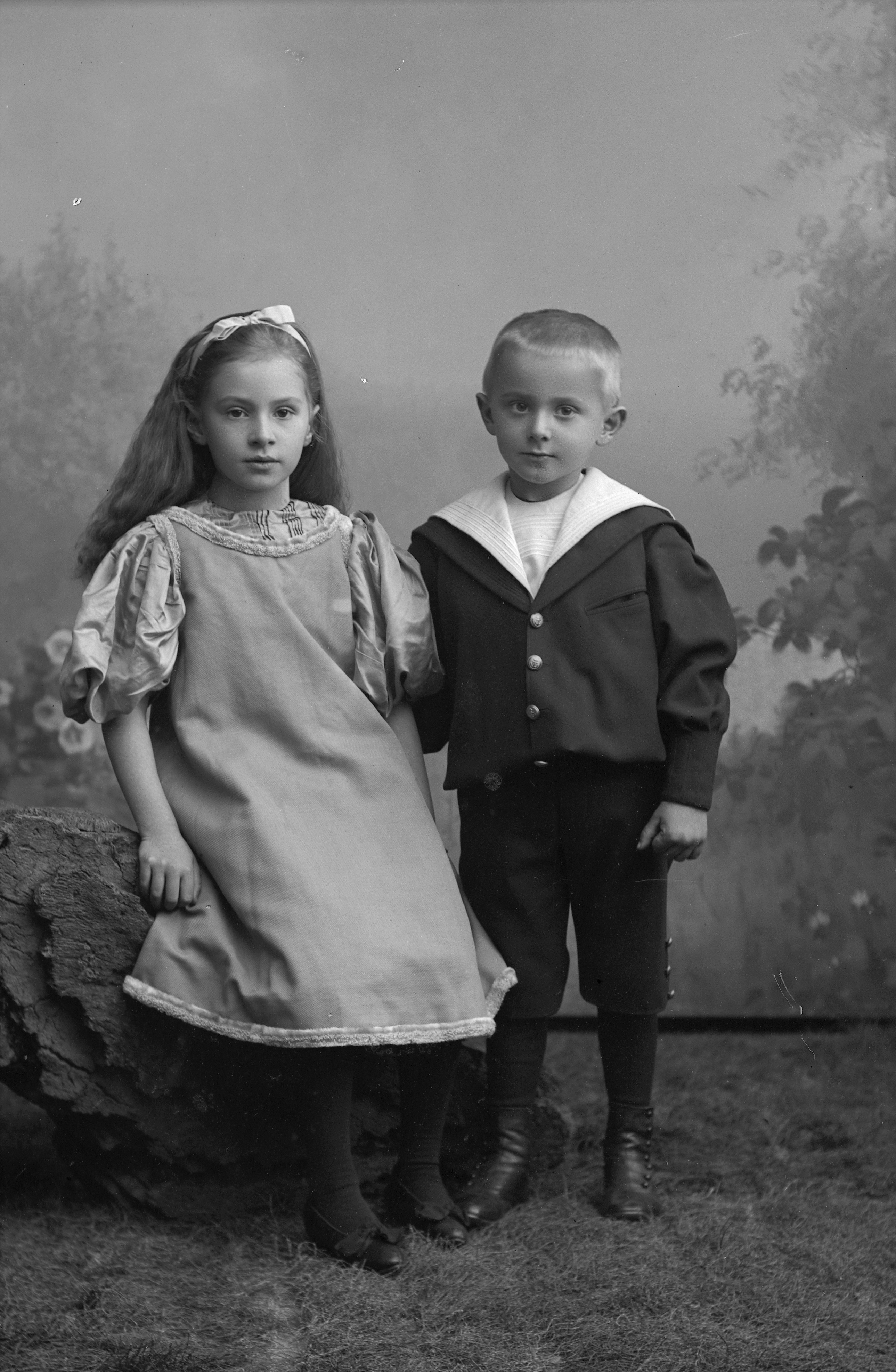 Porträtt i helfigur av Jacques och Lili Morange, lutande sig mot stenmur. Lili med hårband, Jacques iklädd sjömanskostym. Fotograferade framför ateljéfond med skogsmotiv.