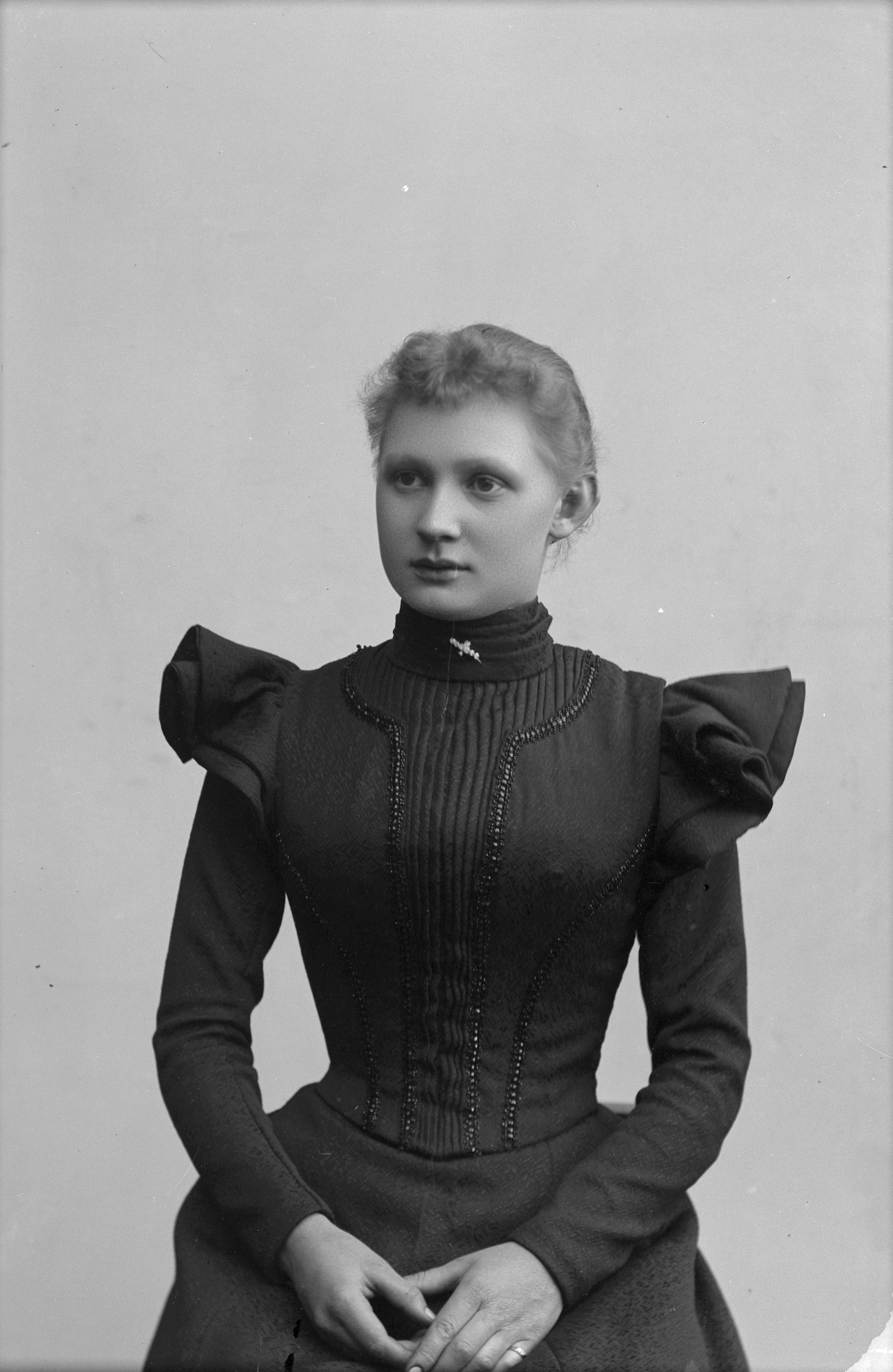 Beskrivning: Porträtt i halvfigur av Agda Dahl.