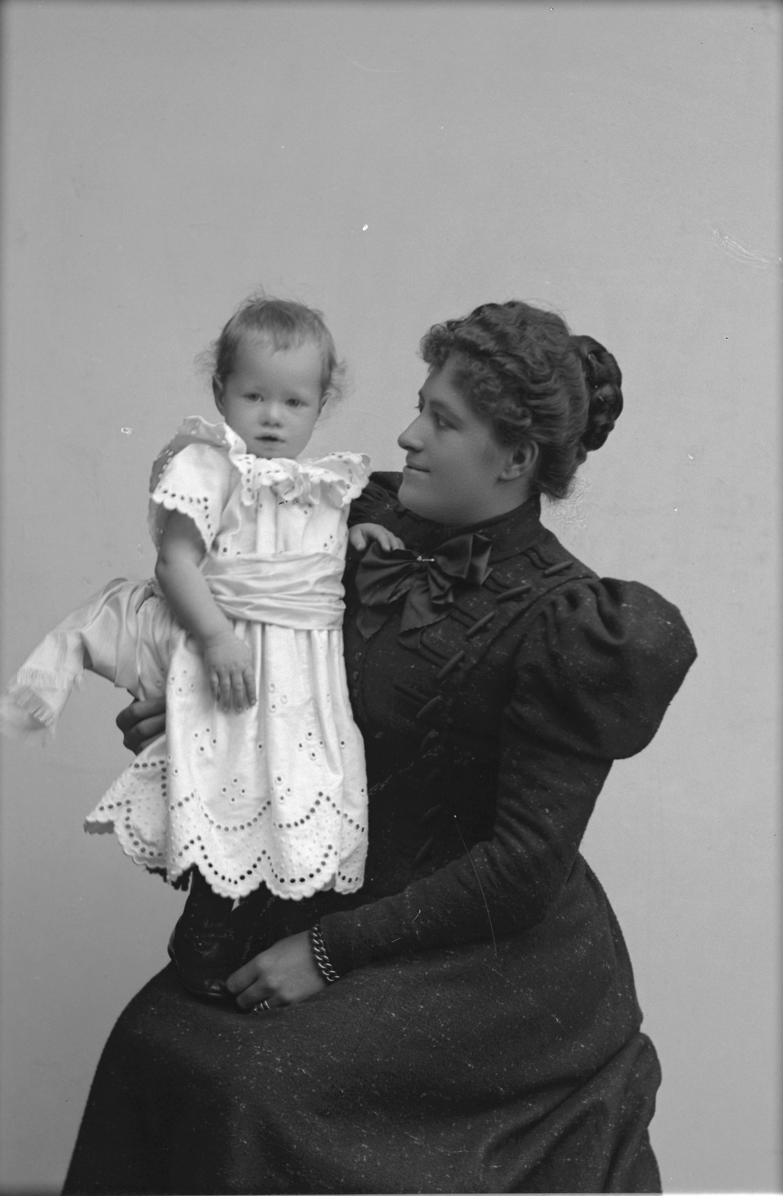 Porträtt i helfigur av fru Edstrand, sittande, med sitt barn stående på moderns knä.