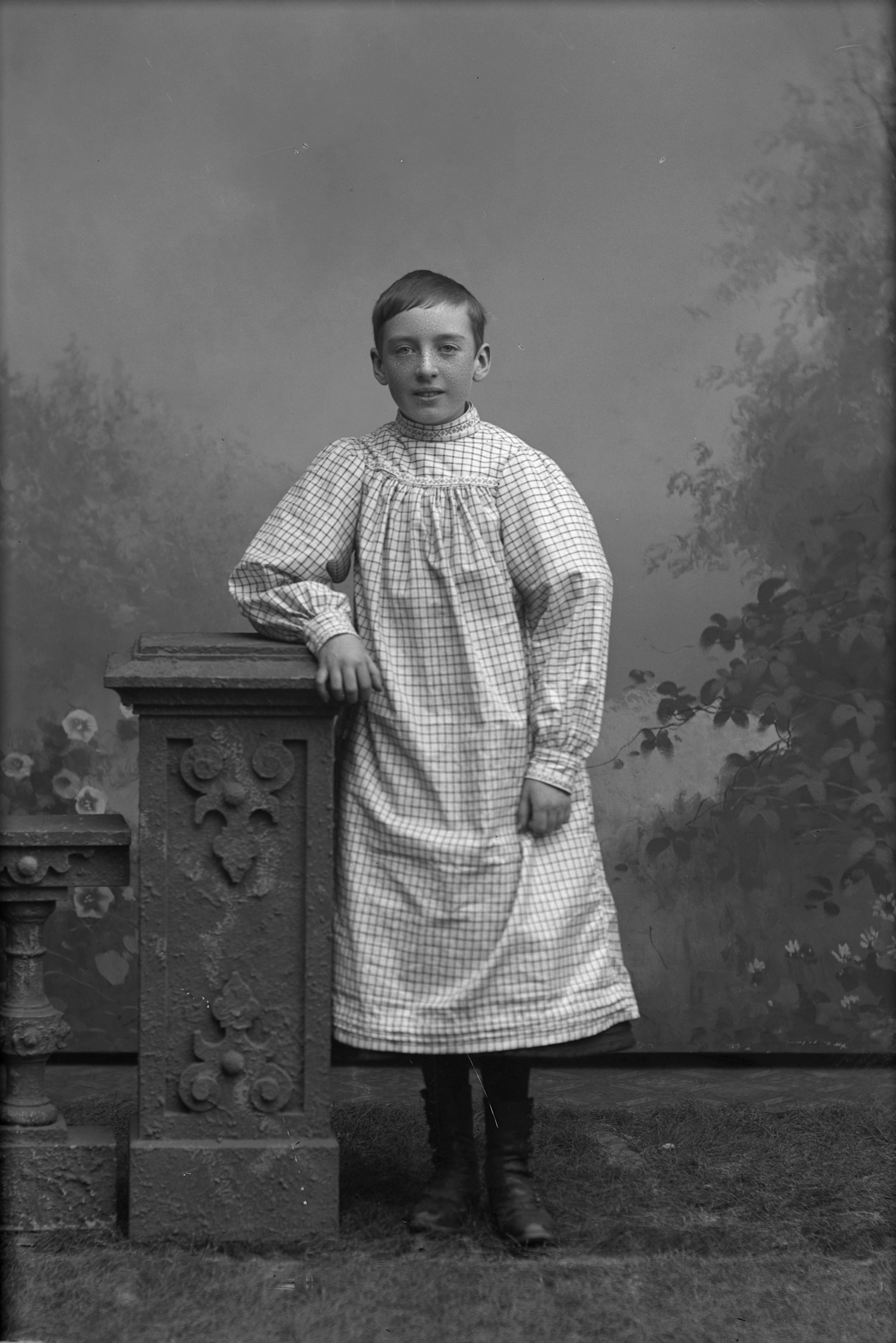 Porträtt i helfigur av Ellen Augusta Maria eller Helga Schweder, stående vid stenpelare. Fotograferad framför ateljéfond med skogsmotiv.