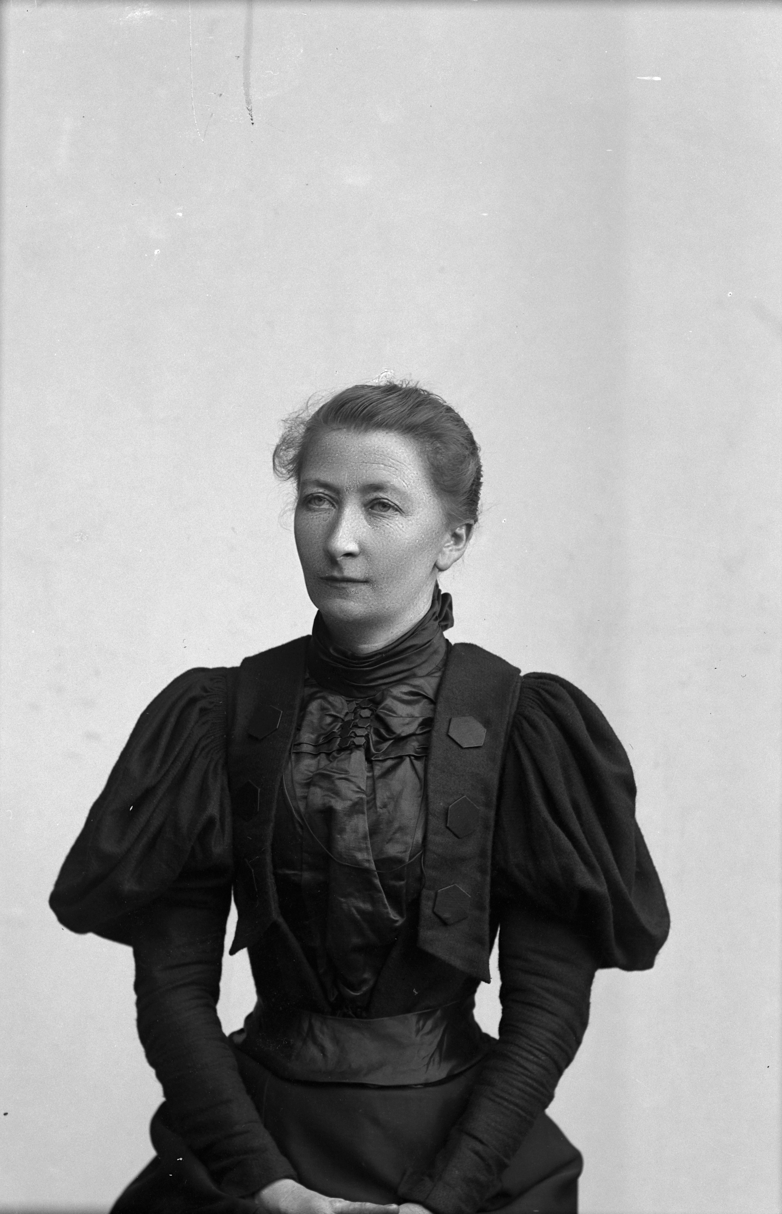 Beskrivning: Porträtt i halvfigur av hushålleskan Augusta Roupé.