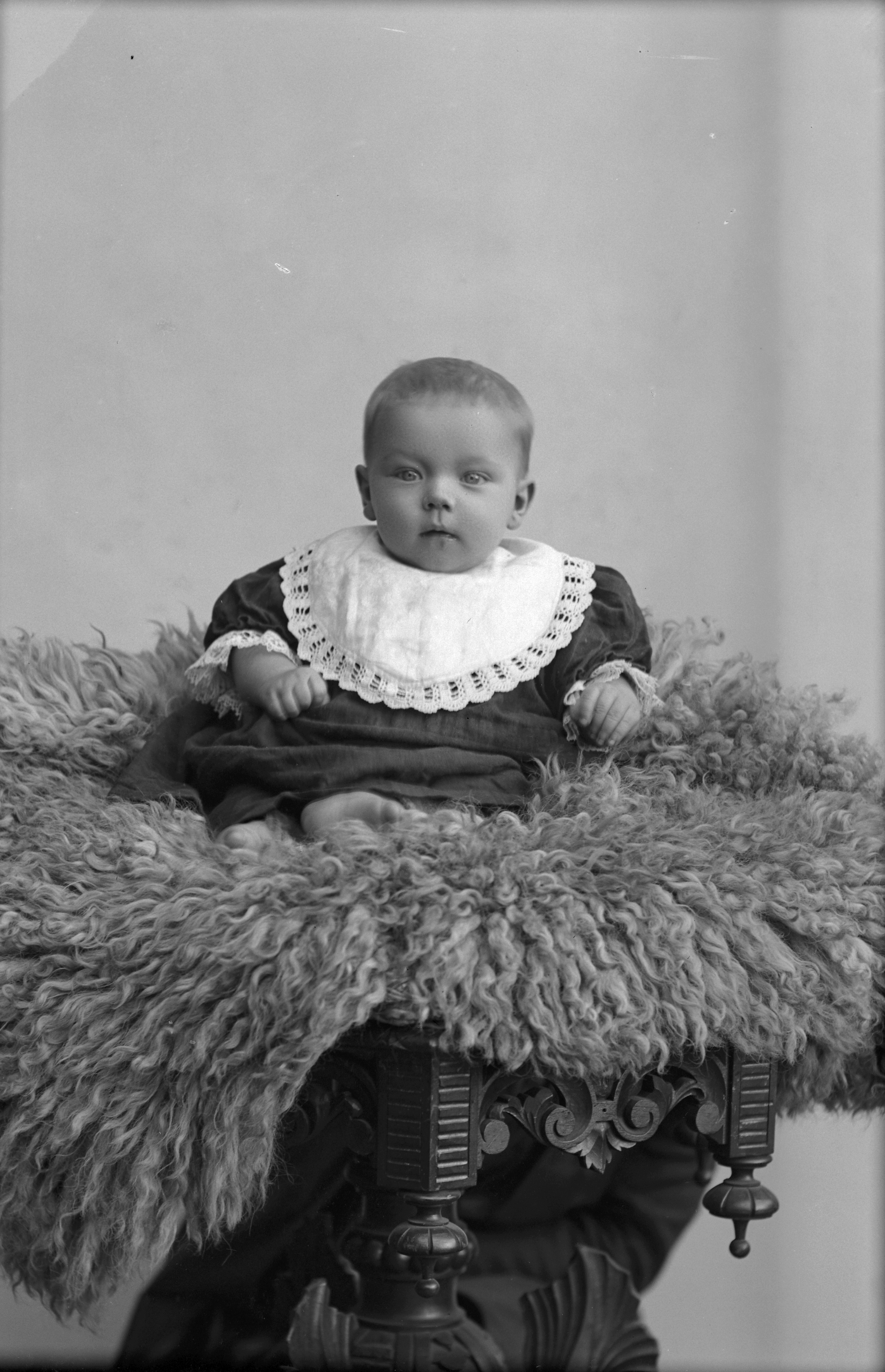 Porträtt i helfigur av Emilia Nilssons barn, sittande på fäll.