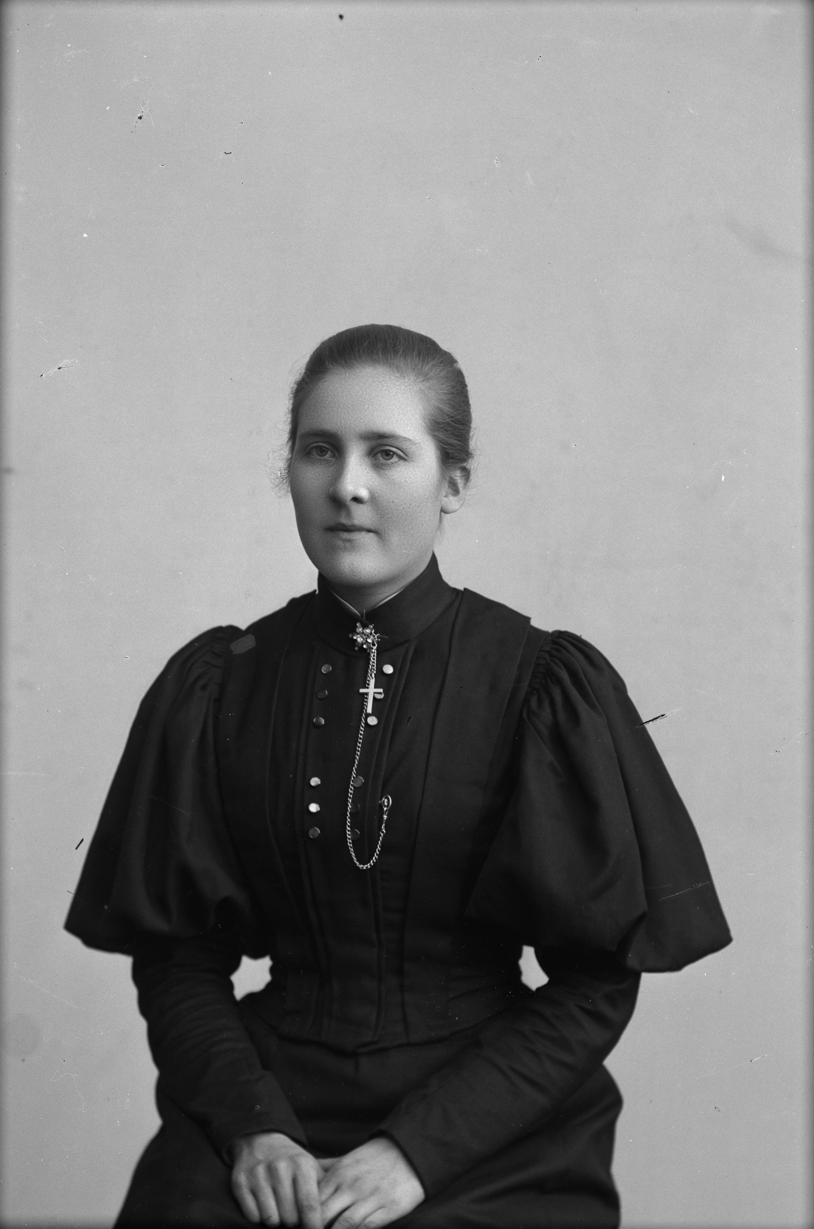 Beskrivning: Porträtt i halvfigur av fröken Lindberg.
