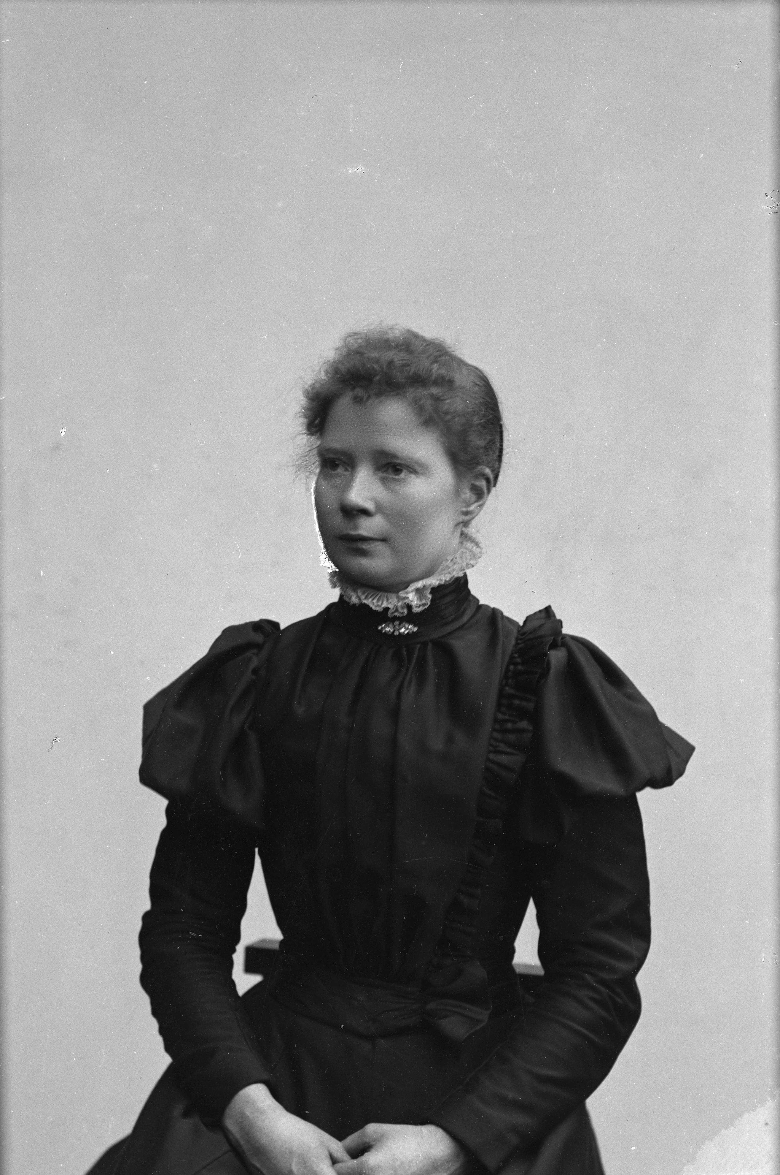 Beskrivning: Porträtt i halvfigur av Augusta Andersson.