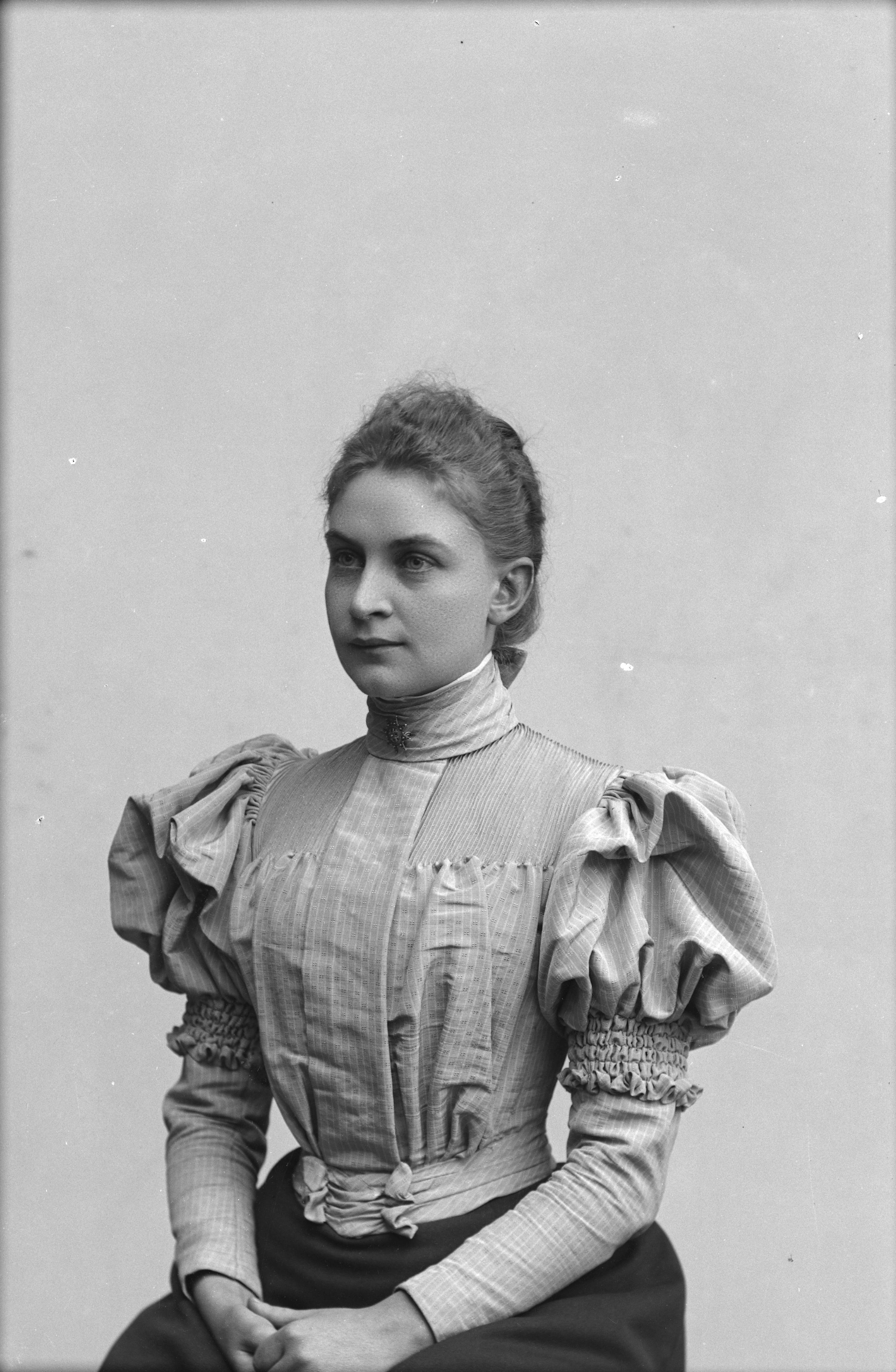 Beskrivning: Porträtt i halvfigur av Ebba Lundgren.