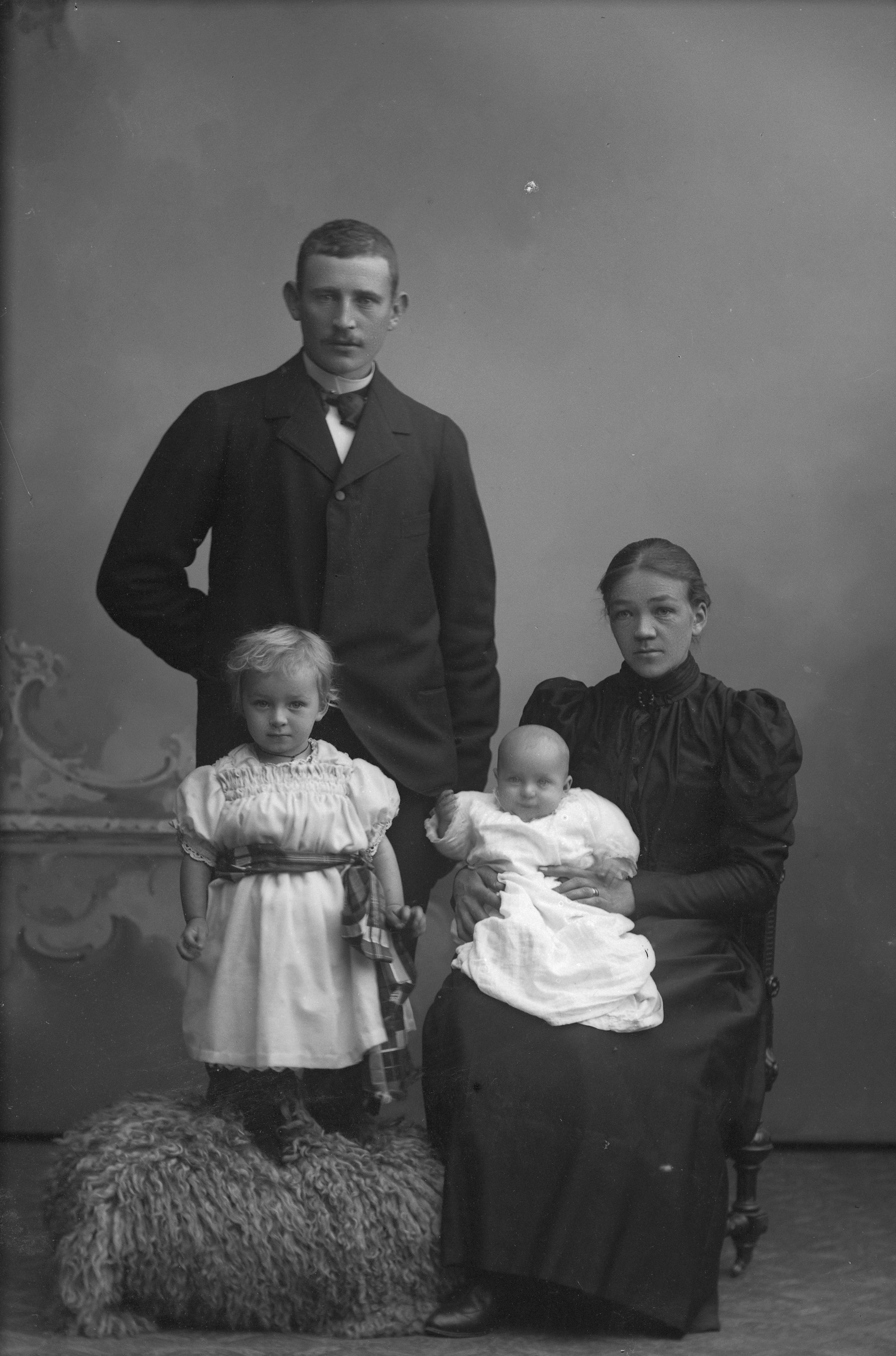 Beskrivning: Porträtt i helfigur av P. Beckström med familj. Frun sittande ned yngsta barnet i knät.