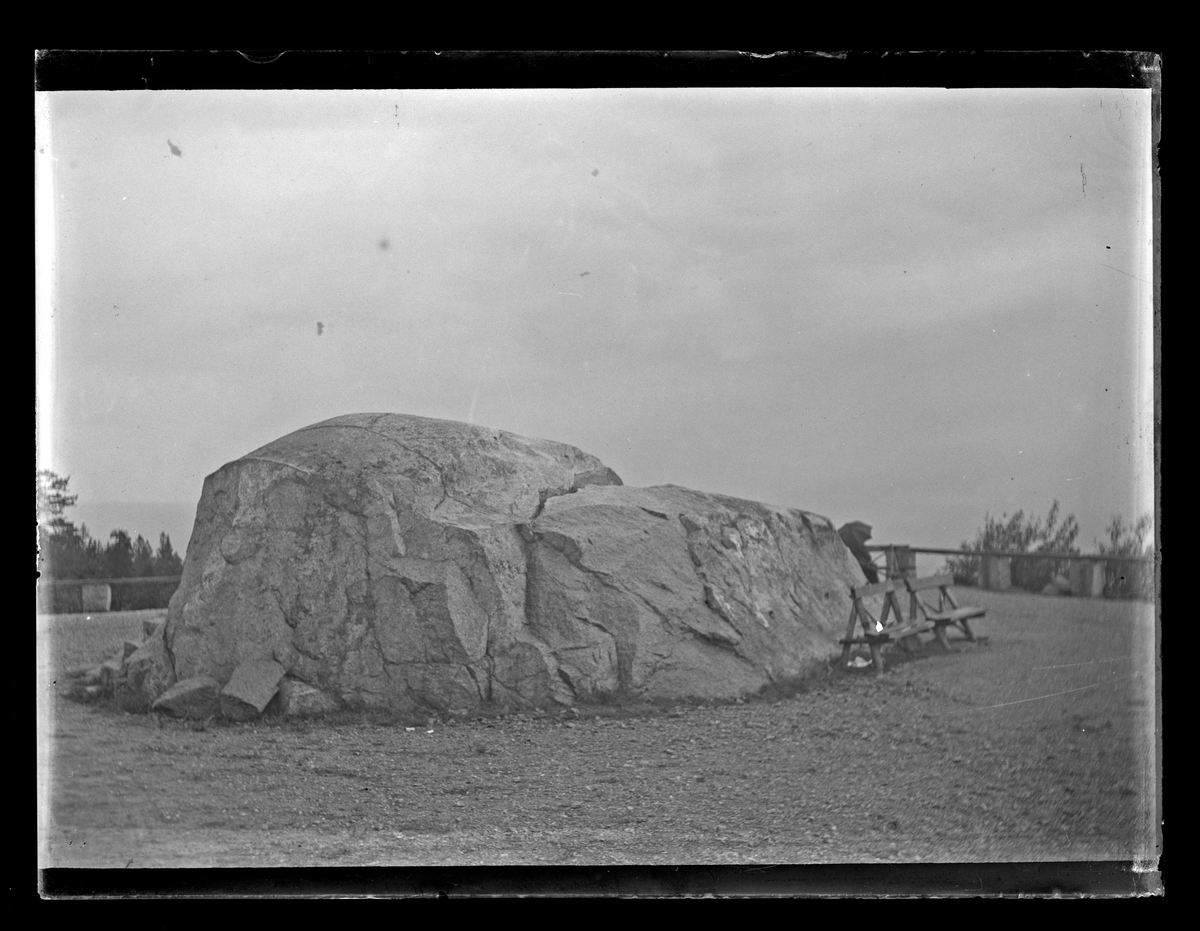 Bilden visar en utsiktsplats på en bergstopp med en stor stenbumling i mitten. Höger av den står två träbänkar.