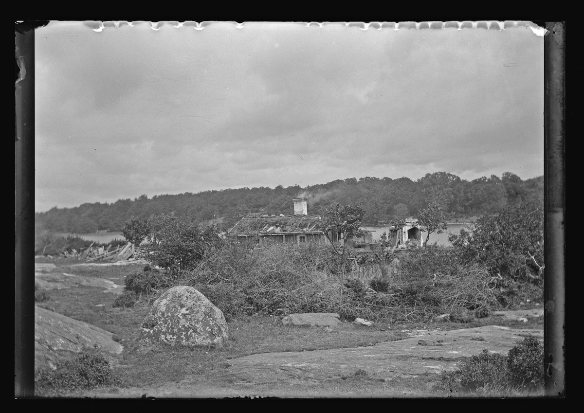 Bilden visar en skadad ekonomibyggnad på Verkö. Halmtaket har delvis rasat ner. Husets gavlar hålls uppe på mäktiga murstockar medan långsidorna är öppna.