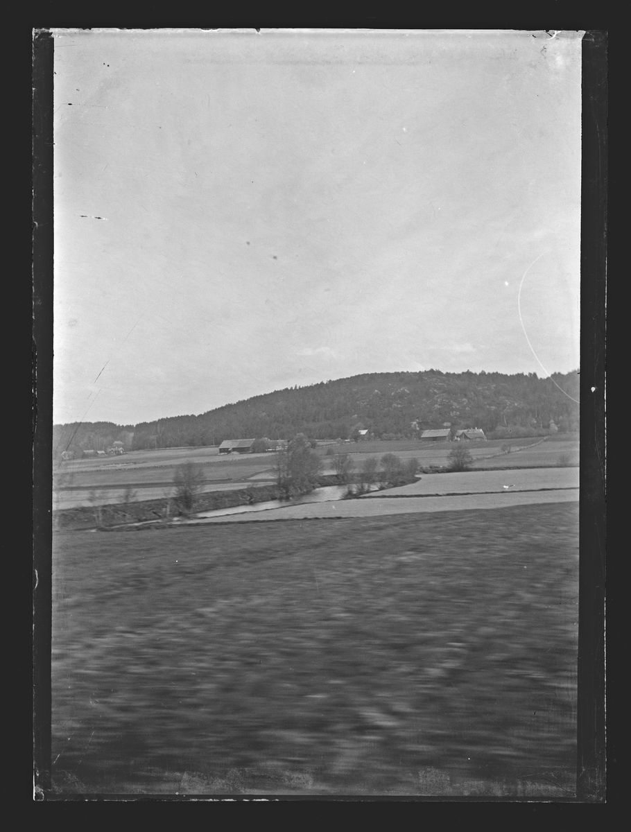Bilden visar en svensk odlingslandskap i Halland med gårdar, ängar, skog och en bergskulle i bakgrunden.