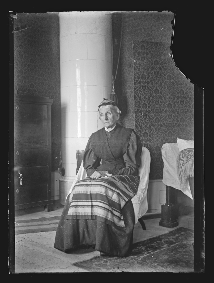 Titel: Bilden visar en gammal kvinna sittandes på en stol framför en kakelugn.