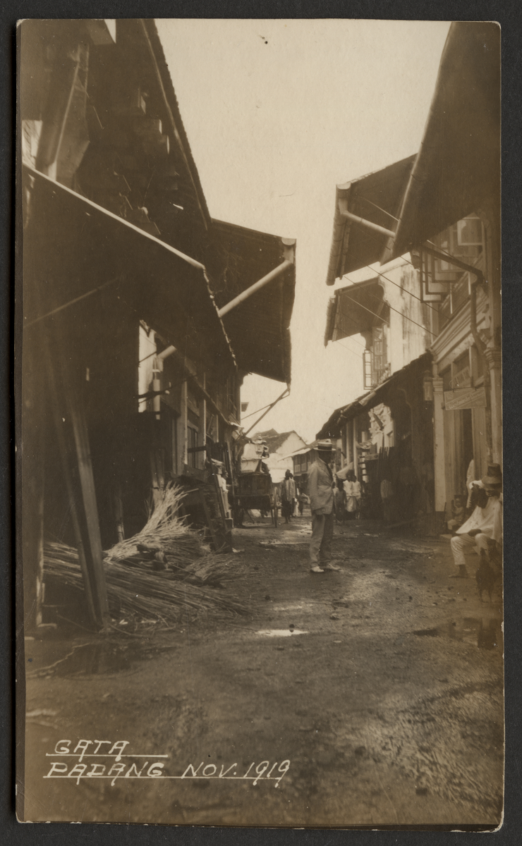 Bilden visar en man i västerländsk kostym som står på en gata i Padang. Gatan har ingen beläggning och flankeras av enkla trähus.