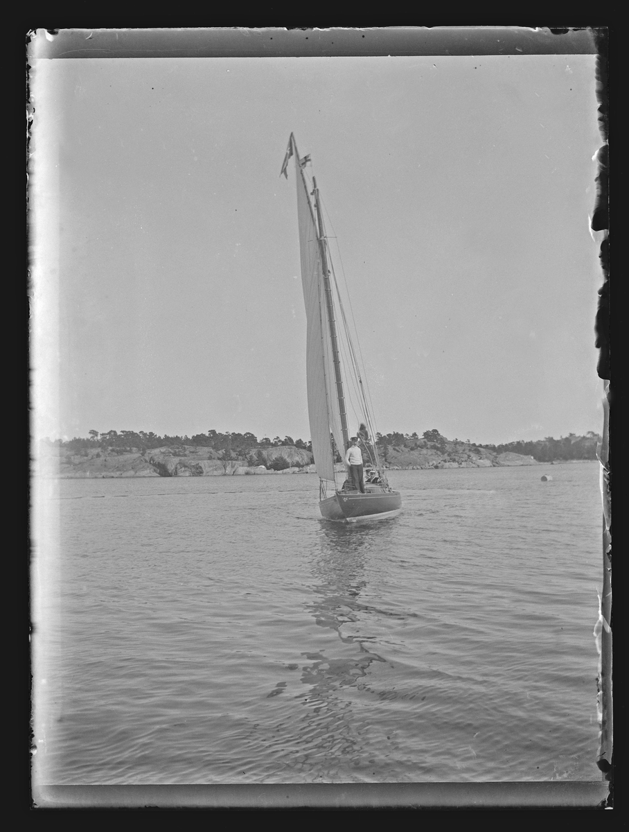 Titel: Bilden visar segelbåten "Afrodite" seglandes framifrån utanför Sandhamn i Stockholms skärgård.
