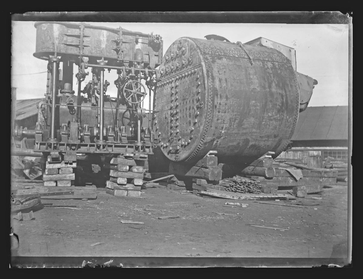 Titel: Bilden visar en ångmaskin med tillhörande ångpanna som förvaras på trästolpar.