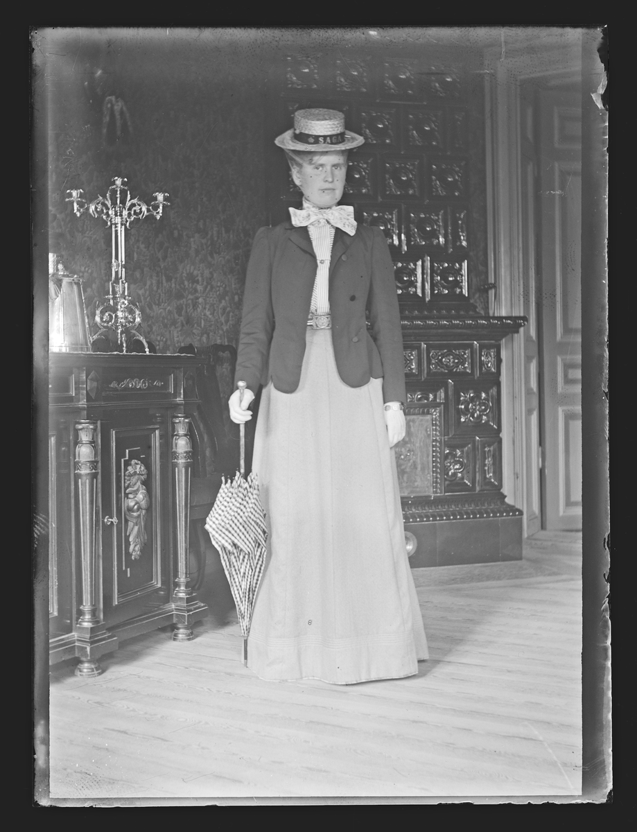 Bilden visar en finklädd kvinna sannolikt i Verkö herrgård. Hon bär ett halmhatt som är smyckat med en mössband från korvetten Saga.