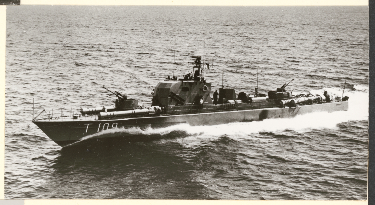 Titel: Bilden visar torpedbåten Antares till sjöss från styrbordssidan.