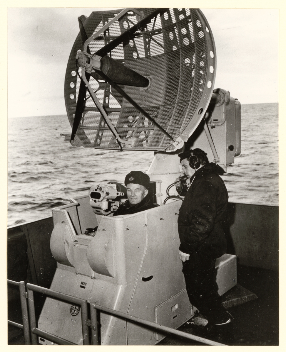 Titel: Bilden visar två män om bord på ett örlogsfartyg som sysslar med en radaranläggning.