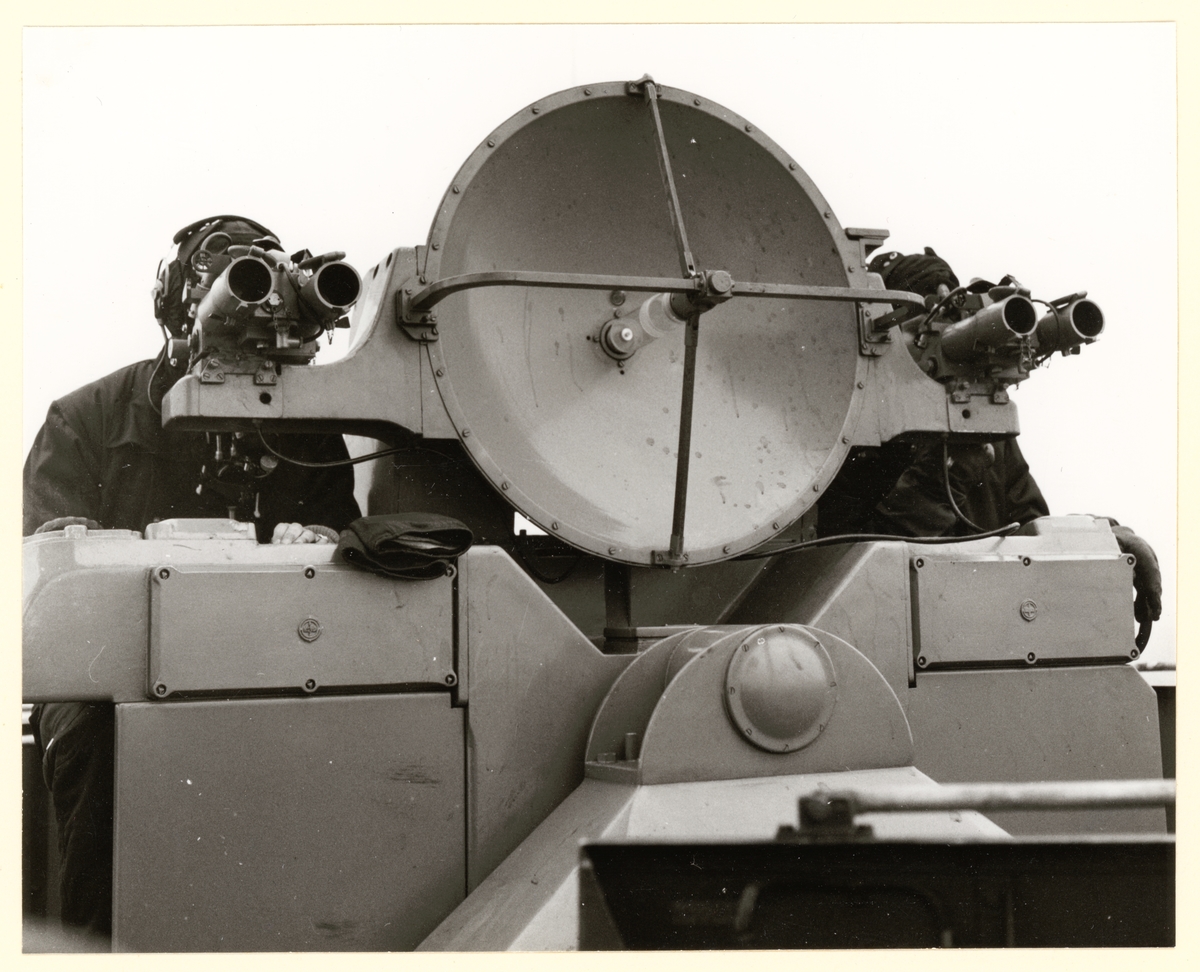 Titel: Bilden visar två män som sysslar med en radaranläggning.