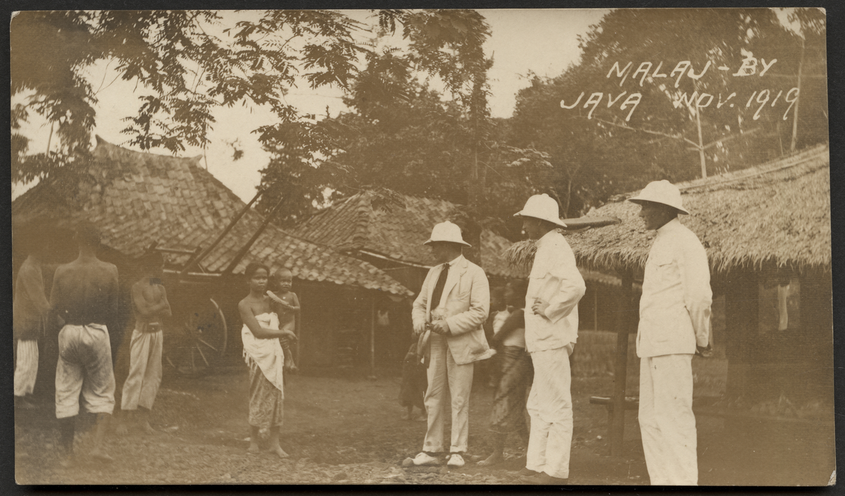 Bilden visar tre män i vita kostymer med tropikhjälmar som tittar på en kvinna med barn på famnen och en grupp män med naken överkropp i en by på Java som består av enkla hyddor.