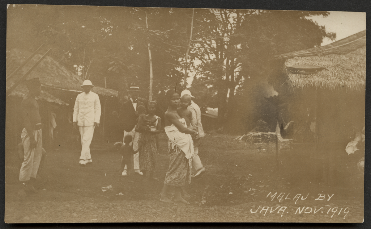 Bilden visar två män i västerländska kläder med tropikhjälm som tittar på kvinnor med barn på famnen i en by på Java som består av enkla hyddor.