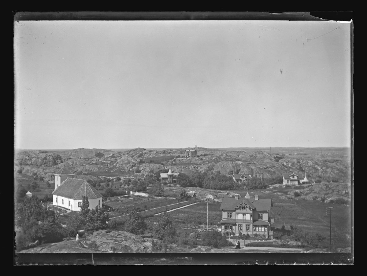 Bilden föreställer en vy över Bratten på Styrsö med kyrkan på vänster sida och en markant trävilla i förgrunden.