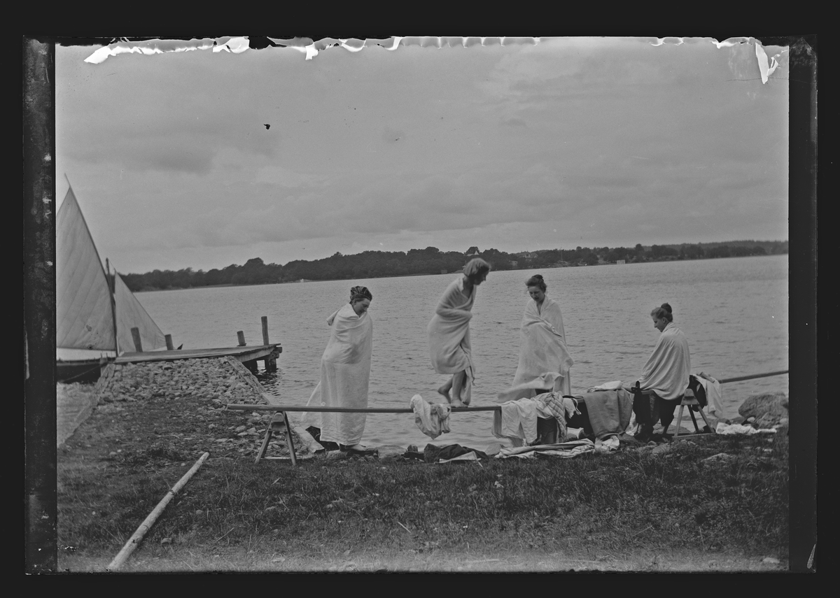 Bilden visar fyra glada kvinnor med badmössor efter en bad i havet. De är inlindat i handdukar, kläderna hänger på en bjälke. En av kvinna försöker balanserar på bjälken.