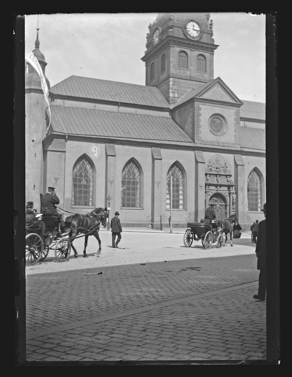 Titel: Bilden visar trafik med hästvagnar framför Sankt Jacobs kyrka i Stockholm.