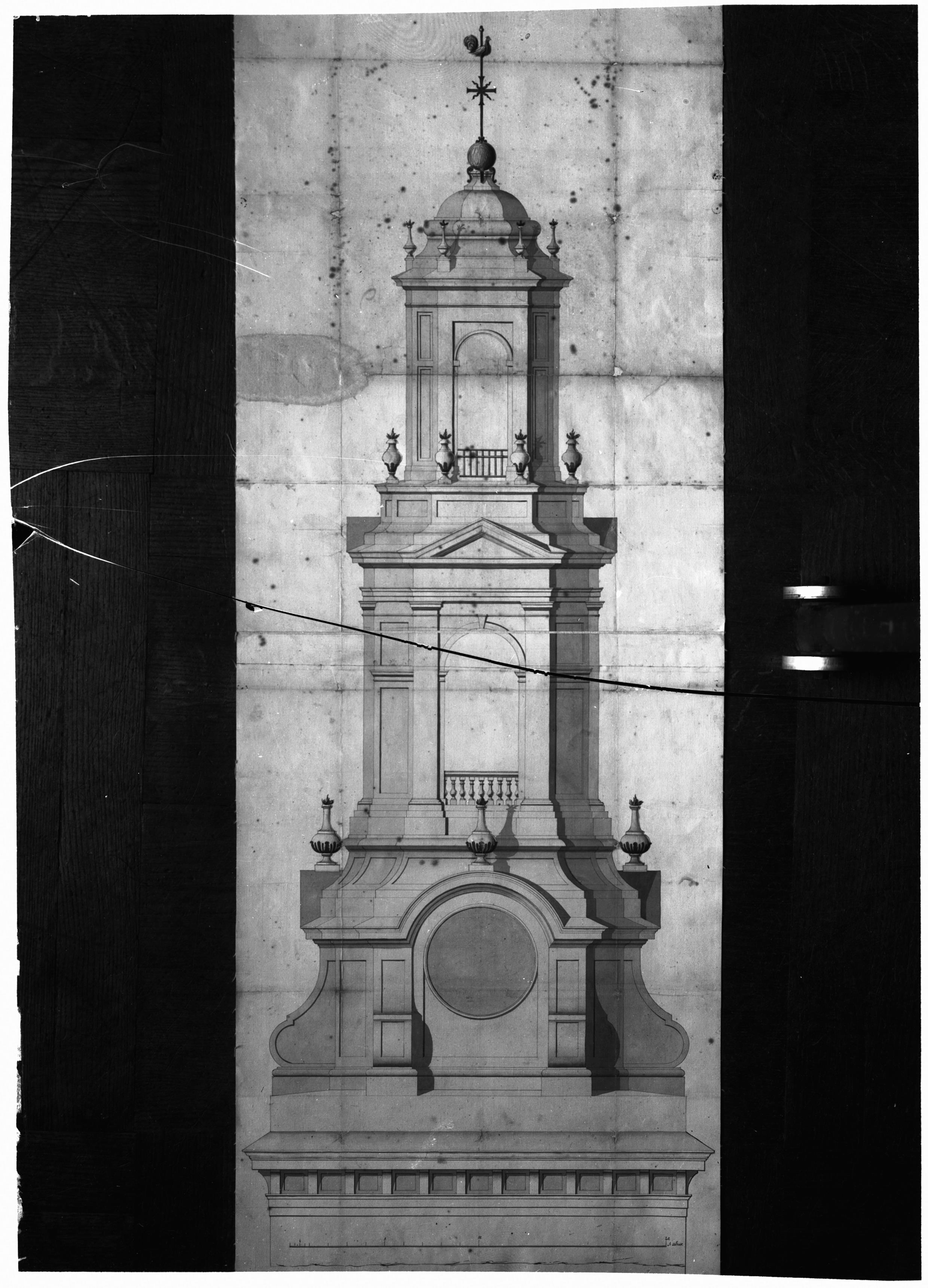Torn, ritning med förslag till tornhuv av stadsarkitekten i Stockholm Johan Eberhard Carlberg 1738, avfotograferad.