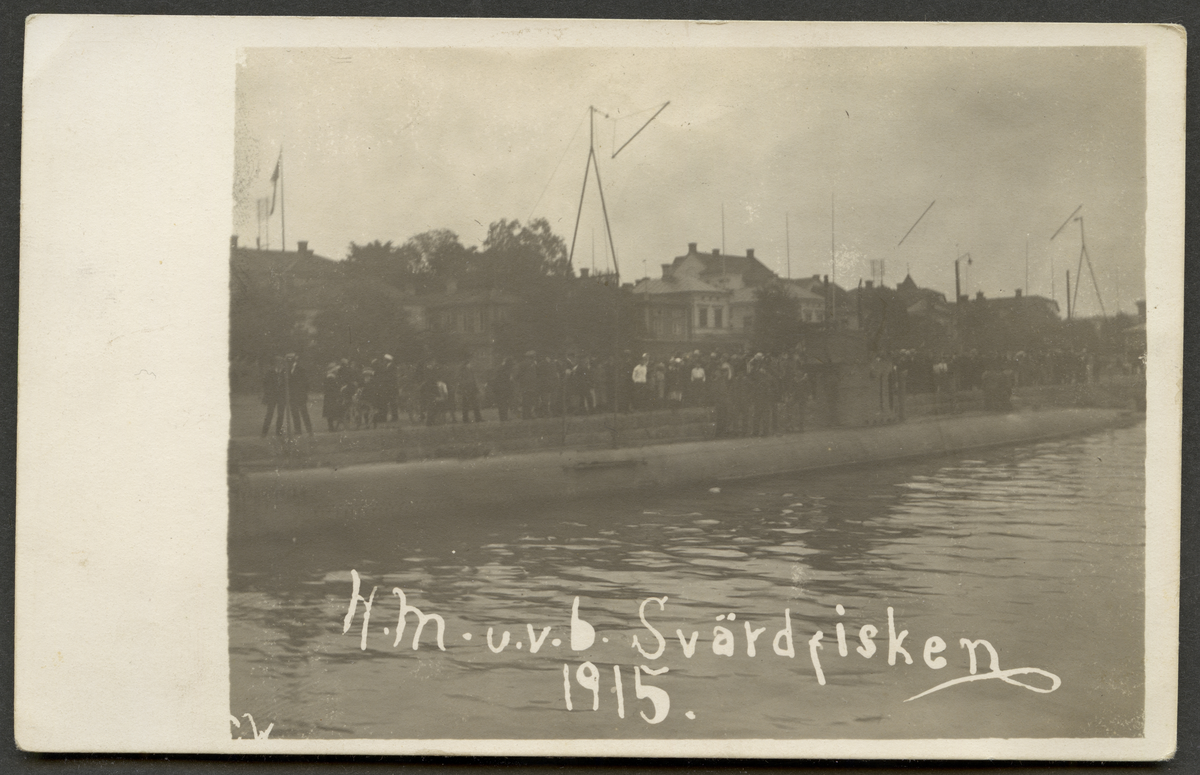Titel: Bilden visar ubåt Svärdfisken som ligger förtöjd vid en kaj.