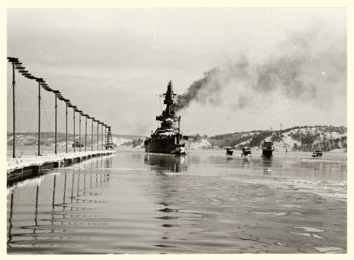 Titel: Ett örlogsfartyg bogseras i en avmagnetiseringsstation.