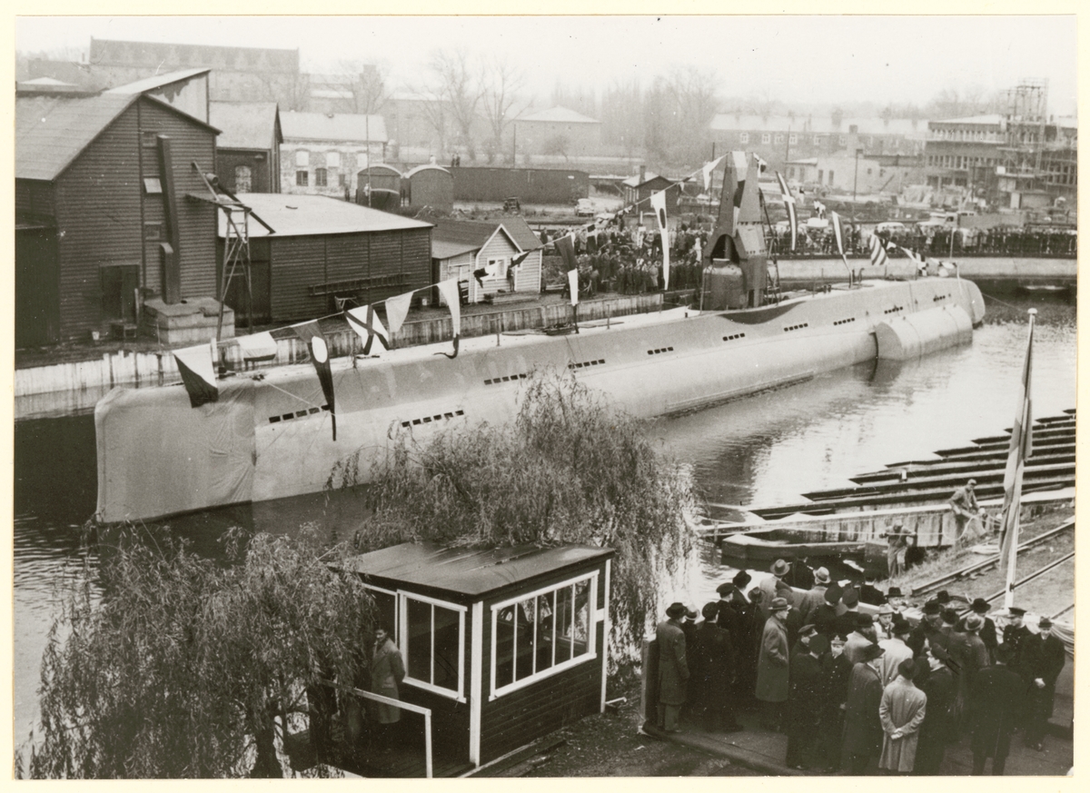 Bilden visar skrovet av ubåten Uttern i en hamnbassäng efter sjösättningen. Runt bassängen står olika grupper av åskådare.