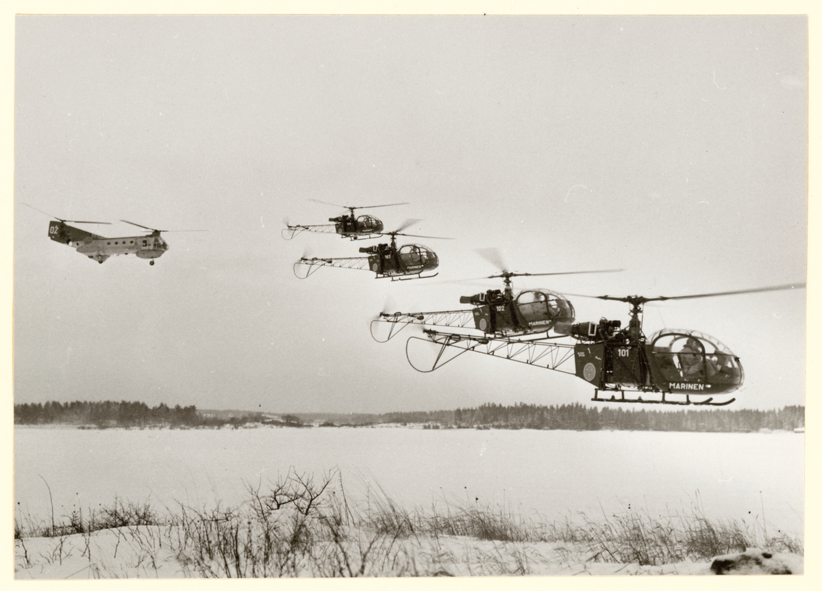 Titel: Bilden visar fyra Alouette och en vertol helikoptrar flygandes över en vinterlandskap.