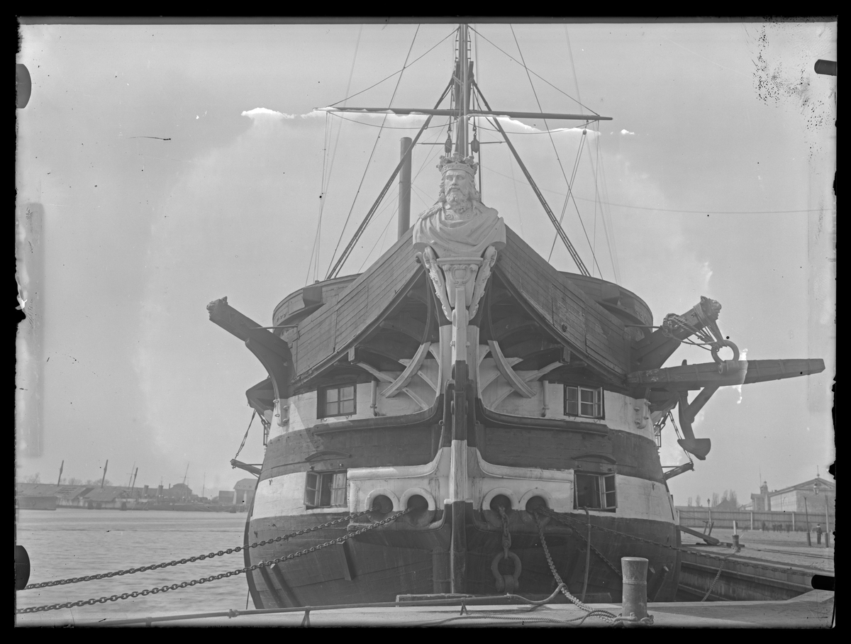 Bilden visar förskeppet framifrån på ånglinjeskeppet Stockholm under sin tid som logementsfartyg i Karlskrona.