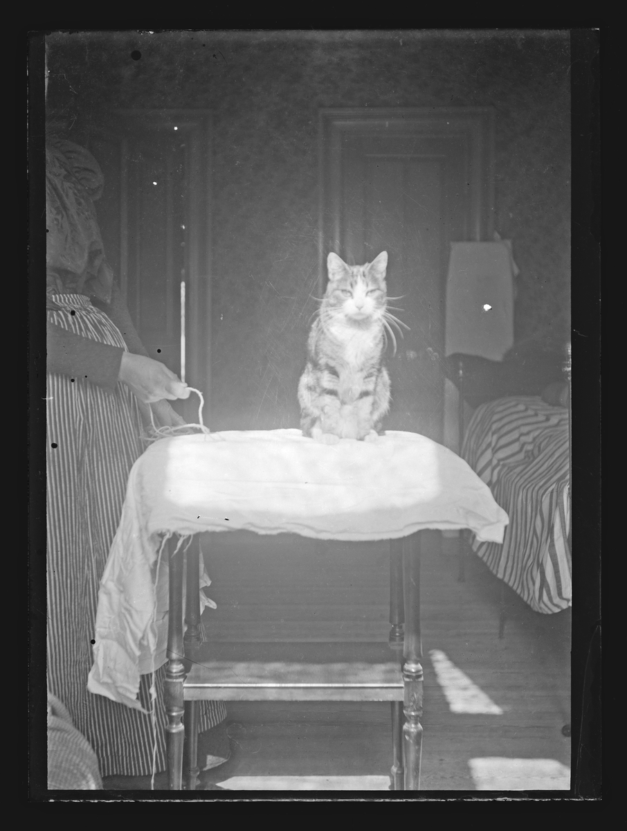 Titel: Bilden visar en äldre kvinna med en katt som sitter på bordet.