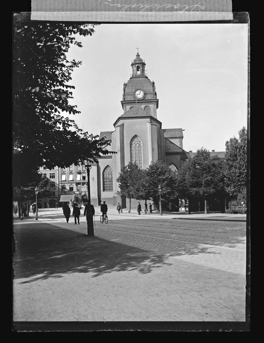Titel: Bilden visar trafik med gångtraffikanter framför Sankt Jacobs kyrka i Stockholm.