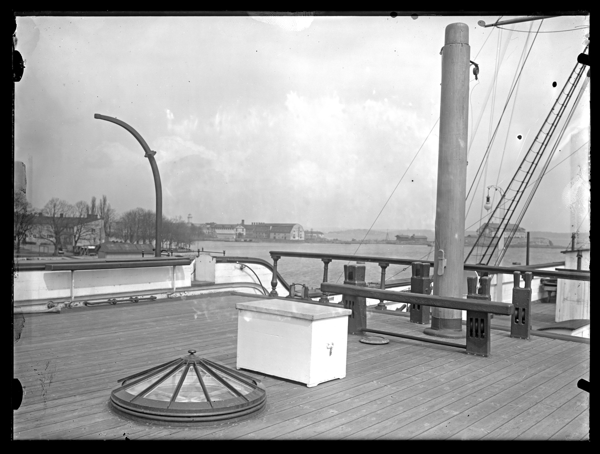 Bilden föreställer en vy över däcket av ånglinjeskeppet Stockholm under sin tid som logementsfartyg i Karlskrona. I bakgrunden syns Stumholmen och bastionen Kungshall.