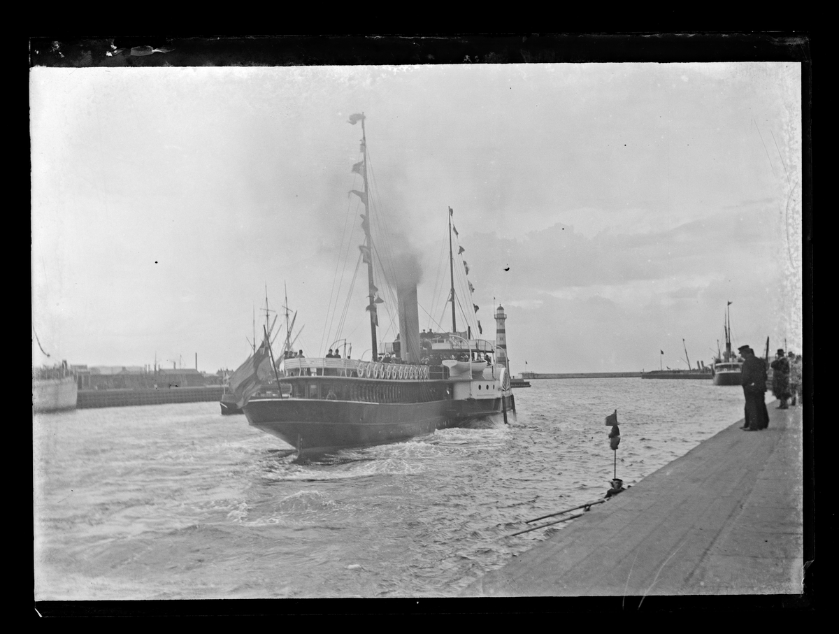 Titel: Bilden visar en hjulångare med passagerae på väg ut ur Malmös hamn.